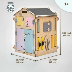 Pastelinis BusyKids veiklos namelis – apgalvota Montessori priemonė mažyliams ir priešmokyklinukams. Vaikai jame žaidžia, slepiasi ir kartu natūraliai treniruoja akių–rankų koordinaciją, sutelktumą ir kantrybę. Stogas slepia piešimo lentą ir rūšiavimo dėlionę, o sienelės vilioja užtrauktukais, lipnia juosta, jutikliniu šviestuvu, žadintuvu, motoriniais elementais, mygtukais, langais ir durimis. Atidarinėti, uždarinėti ir mėtyti žaislus į vidų bei lauk – tai vaikų mylimiausia veikla.