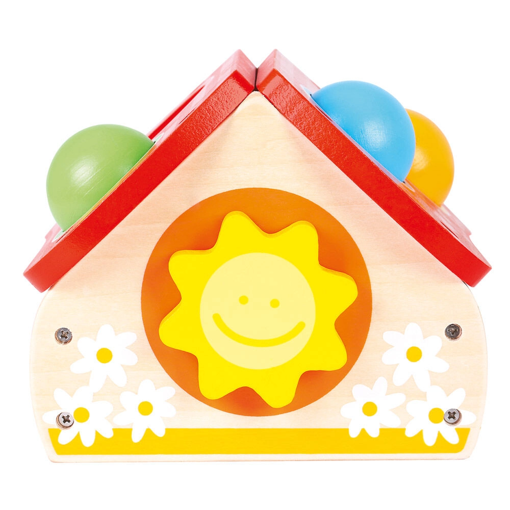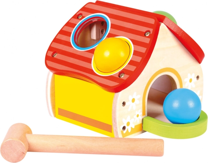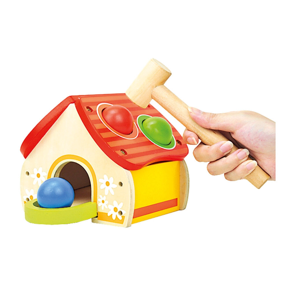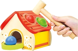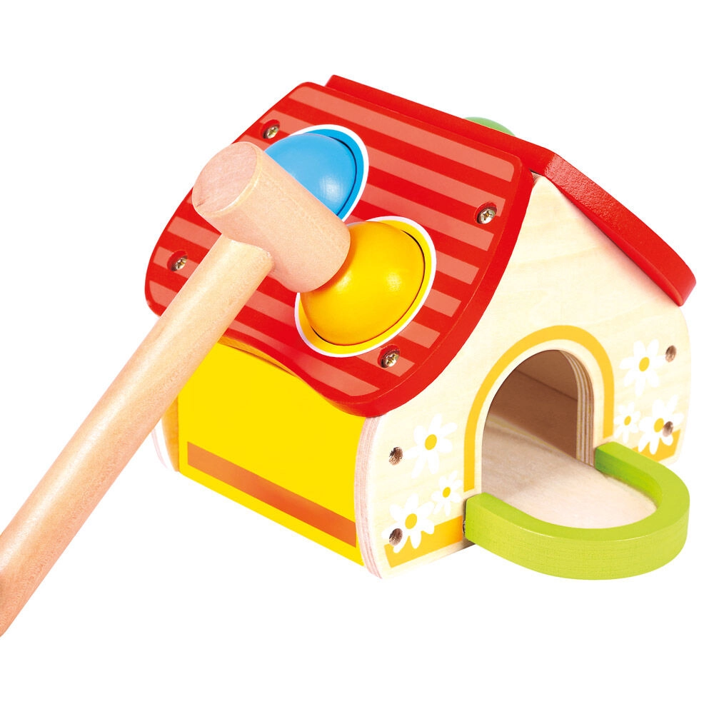 Šis kokybiškas medinis žaislas linksmu namelio pavidalu sudomina vaikus ryškiomis spalvomis ir paprastu žaidimo principu – kamuoliukai dedami į stogo angas ir švelniai kalami plaktuku. Pramoga skatina motorikos, kantrybės ir tikslumo ugdymą.