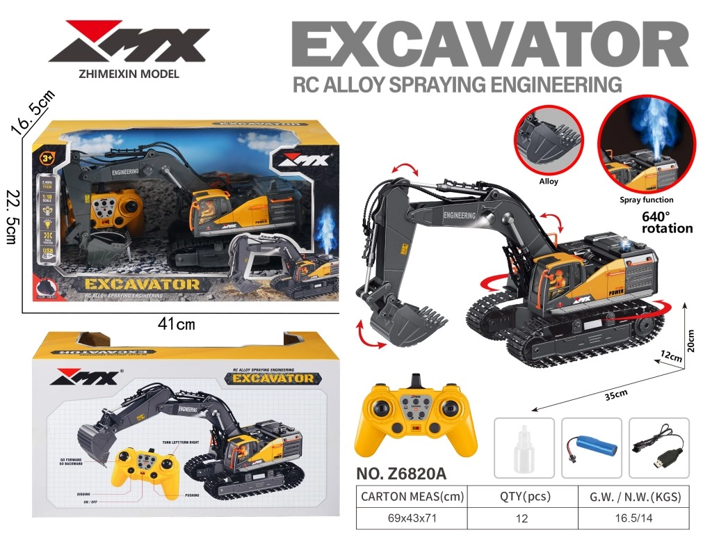 2,4 GHz dažnio valdymas su iki 30 m nuotoliu suteikia sklandų valdymą be trukdžių. Bokštas sukasi iki 640°, todėl galite tiksliai imituoti tikrus statybos darbus. Ekskavatorius siūlo šviesos ir garso efektus bei patrauklų garų (spray) efektą, kuris sustiprina važiavimo ir kasimo įspūdį.