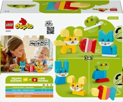 Atraskite pirmąją konstravimo rinkinio patirtį patiems mažiausiems – LEGO DUPLO Mieli kūrybiški augintiniai 3 viename. Rinkinyje yra 24 didelės kaladėlės, leidžiančios vaikams nuo 18 mėnesių lengvai pastatyti šuniuką, katytę ir paukštelį. Skatina smulkiąją motoriką, spalvų atpažinimą ir kūrybišką žaidimą dėl paprasto dėliojimo ir draugiškų veidelių atspaudų.