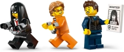 Komplekte yra raudonas motociklas su grandine ir kabliu dramatiškiems pabėgimams ir gaudynėms. Rinkinys apima 3 minifigūrėles – policininką su arešto orderiu ir ieškomo asmens plakatu bei du nusikaltėlius (įskaitant veikėją oranžinėje kalinio uniformoje). Naudodamiesi LEGO Builder programėle, vaikai gali konstruoti pasitelkdami intuityvią 3D instrukciją.