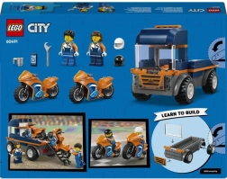 Atraskite veiksmo kupiną rinkinį mažiesiems lenktynininkams: LEGO City motociklų gabenimo sunkvežimis siūlo plokščią platformą su rampa, 2 sportinius motociklus, 2 lenktynininkų minifigūrėles su šalmais ir tvirtas gumines padangas stabiliai kelionei. Idealu vaikams nuo 4 metų dėl pradedančiųjų kaladėlės ir paprasto instrukcijų vadovo.