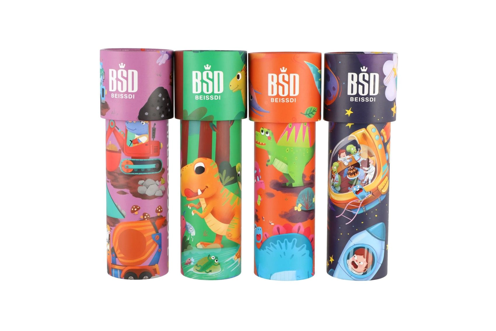Žaismingos dinozaurų iliustracijos skatina vaizduotę ir paverčia kaleidoskopą patrauklia maža dovana.