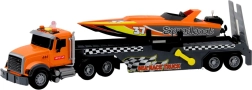 Šis patrauklus rinkinys nukelia vaikus į vandens lenktynių ir specialaus pervežimo pasaulį. Didelis sunkvežimis su žemagrinde priekaba gabena sportinį greitaeigį katerį, kurį užsukus galima naudoti ir vonioje ar baseine. Derinys iš šviesos ir garso efektų bei detalių spaudinių kuria autentišką žaidimo įspūdį.