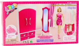 Sukurkite tobulą lėlių spintą su šiuo stilingu rožiniu–baltu rinkiniu. Aukšta spinta su atidaromomis durelėmis ir keturiais stalčiais suteikia daug vietos suknelėms, aksesuarams ir mėgstamiems drabužėliams, o pastatomas veidrodis su puošniu rėmu įkvepia madingoms scenoms ir kasdieniams žaidimams.