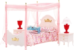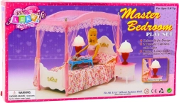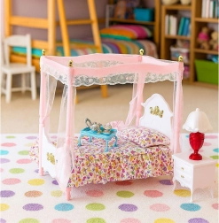 Elegantiškas miegamojo rinkinys maždaug 29 cm aukščio lėlėms sužavės lova su baldakimu, lengvomis užuolaidėlėmis ir kruopščiu apdirbimu. Rinkinyje yra du naktiniai staliukai, lemputės ir pilnas patalynės komplektas. Pastelinė rožinė–balta spalvų derinys ir kokybiška medžiaga užtikrina patvarumą ir ilgalaiką pramogą, lavinant kūrybiškumą ir fantaziją.