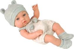 Žavus 18 cm ūgio kūdikėlis džiugina realistiškomis detalėmis ir malonia, minkšta medžiaga. Dėl judančių galūnių ir galvos lėlytę lengva pasodinti ar paguldyti. Ji aprengta baltu smėlinuku su pilkais akcentais, turi minkštą kepurytę su ausytėmis ir seilinuką su kaspinėliu – ideali rūpesčio žaidimams ir vaizduotei lavinti.