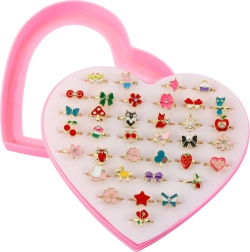Šis spalvingas žiedelių rinkinys pradžiugins visas mažąsias puošeivas. Dėl reguliuojamo skersmens žiedelius lengva pritaikyti vaikiškiems pirštukams – jie patogūs ir saugūs dėvėti. Permatomas širdelės formos dėklo dangtelis leidžia patogiai laikyti ir greitai išsirinkti mėgstamus motyvus.