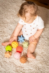 Kiekvienas kamuoliukas turi unikalų paviršių su iškilimais, kauburėliais ar grioveliais, kurie lavina lytėjimą ir natūralų vaiko smalsumą.