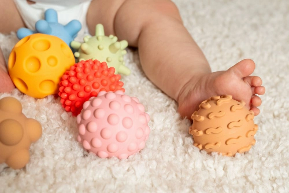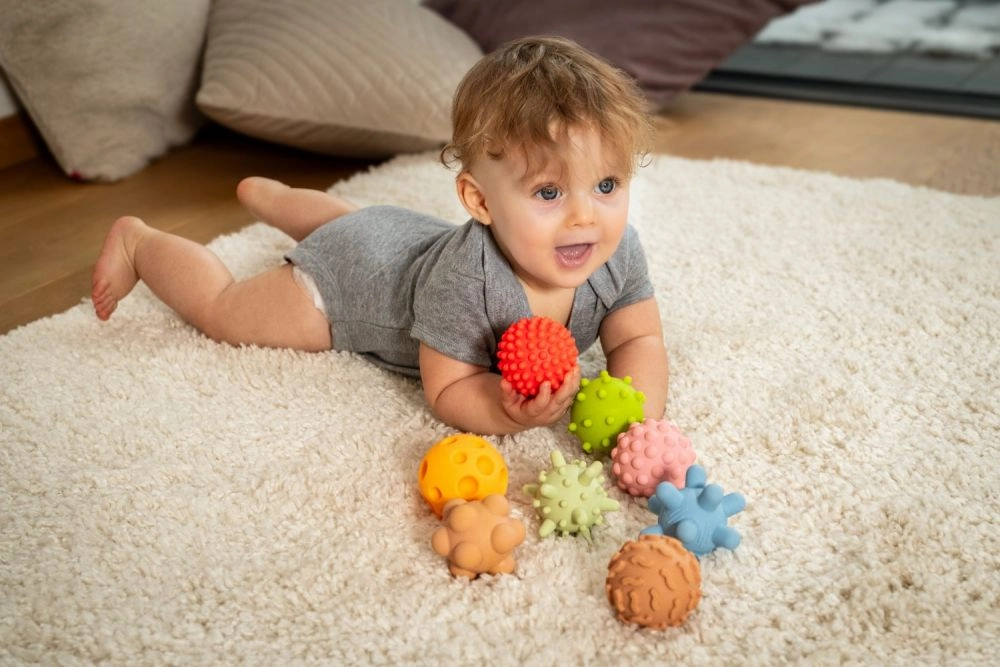 Sensoriniai kamuoliukai švelnių pastelinių spalvų sukurti mažiausioms rankytėms. Dėl įvairių paviršių – iškilimų, spygliukų ir taškelių – vaikai tyrinėja pasaulį lytėjimu, lavina akių–rankų koordinaciją ir mokosi suimti bei spausti. Minkšta medžiaga maloni liesti ir saugi kasdieniam žaidimui.