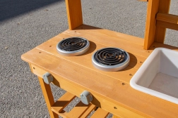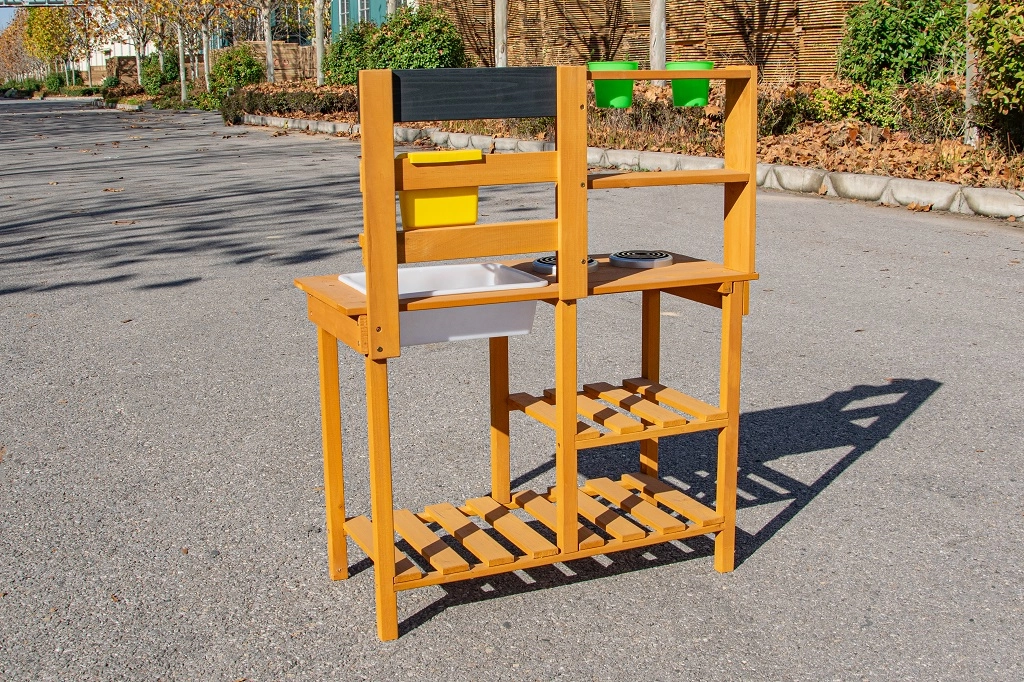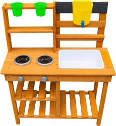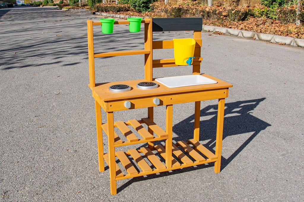 Ši lauko vaikų virtuvėlė idealiai tinka „mud kitchen“ veikloms ir klasikiniam vaidmenų žaidimui gaminant. Tvirta medinė konstrukcija lengvai prižiūrima ir siūlo stabilią darbo vietą su dviem kaitlentėmis, plastikine kriaukle ir praktiškais kabliukais bei laikikliais priedams. Talpa su čiaupu leidžia saugiai ir linksmai eksperimentuoti su vandeniu.