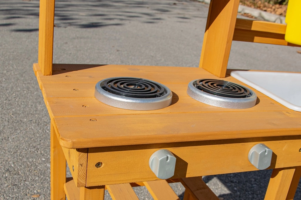 Skatinkite vaikų fantaziją gryname ore su šia kokybiška medine sodo virtuvėle. Ji siūlo plastikinę kriauklę su galimybe žaisti su vandeniu, dvi kaitlentes su pasukamais rankenėlėmis, vandens talpą su čiaupu ir erdvias atviras lentynas patogiam visų reikalingų daiktų laikymui. Patvari konstrukcija ir apgalvotas išdėstymas palaiko vaidmenų žaidimus gaminant, kūrybiškumą ir vaikų savarankiškumą.
