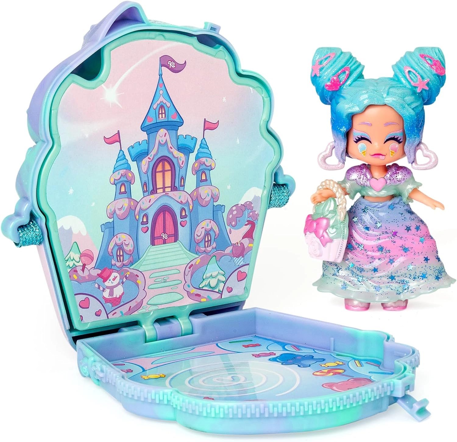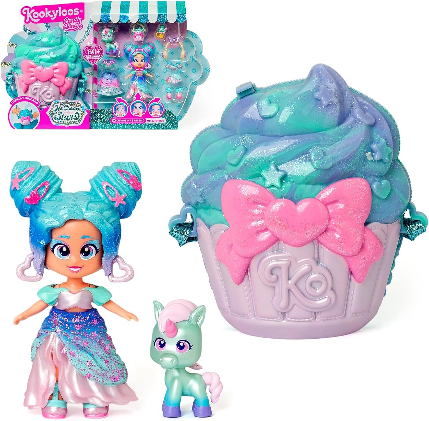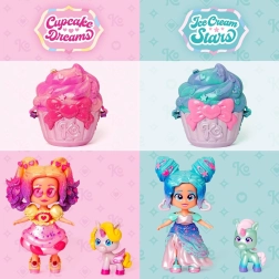- Candy Cream Stars figūrėlė, 3 drabužių stilizacijos, 2 poros batelių, mažas vienaragis, priedas–užkandis, keksiuko formos rankinė