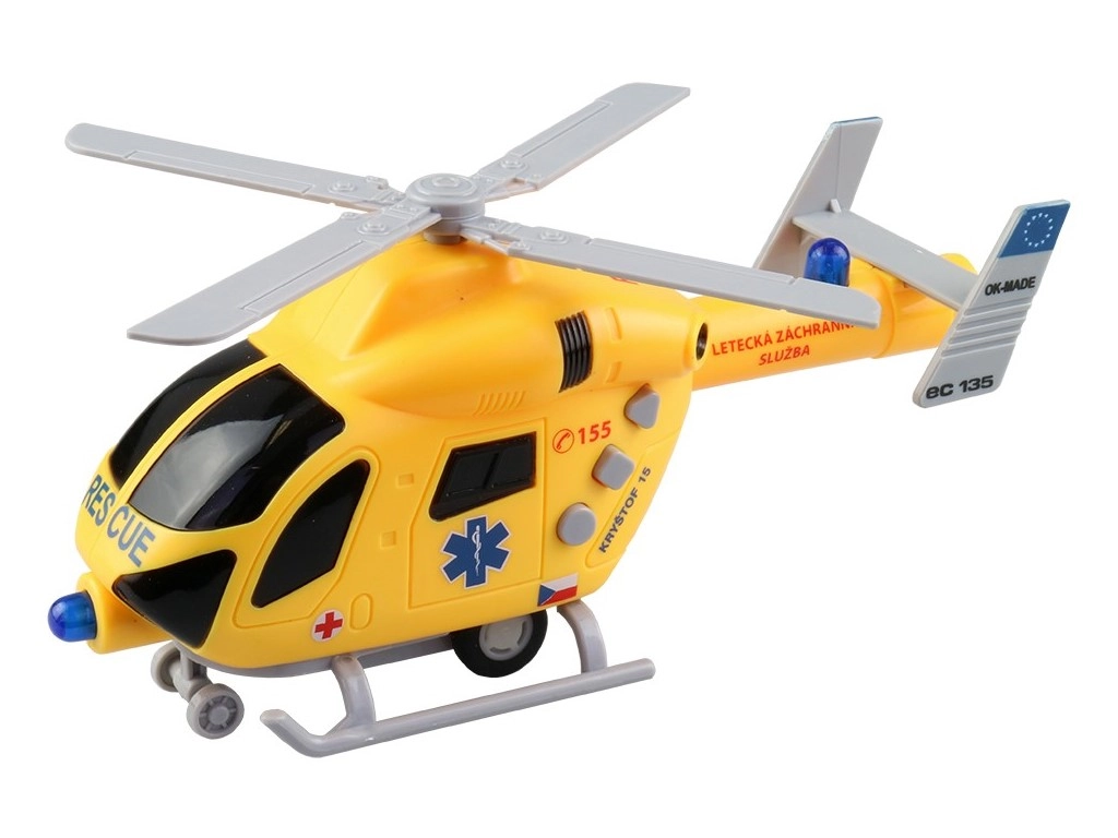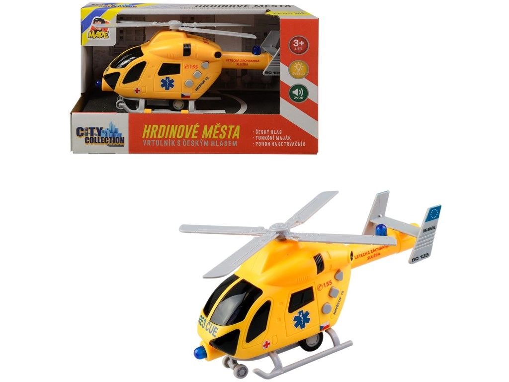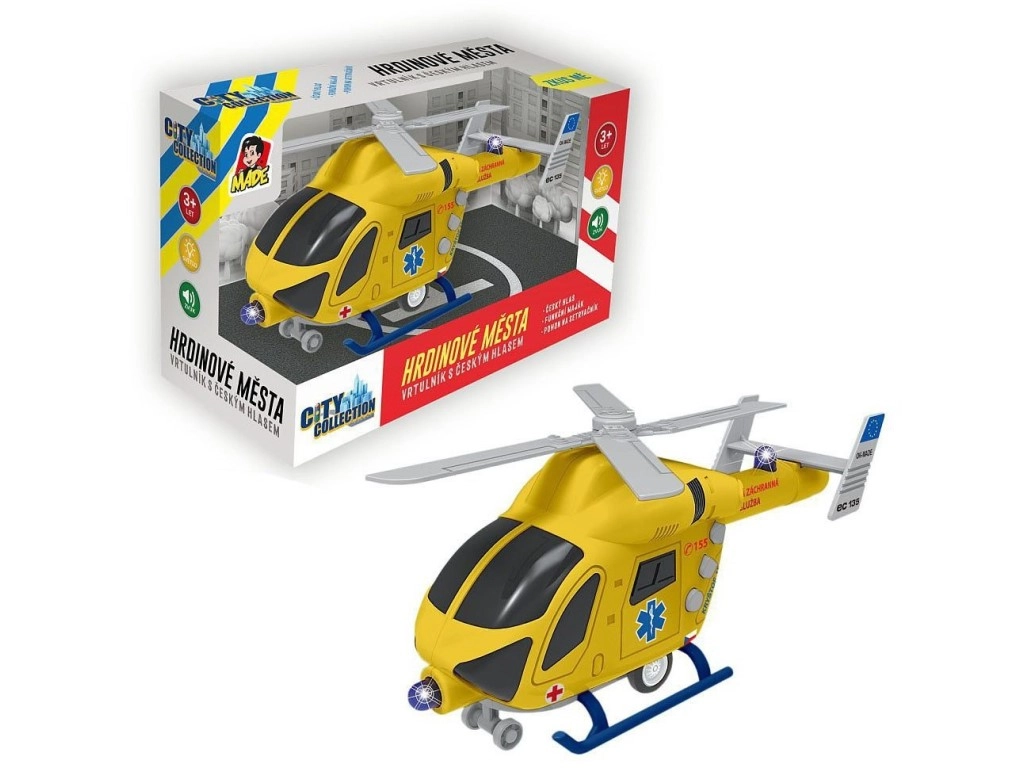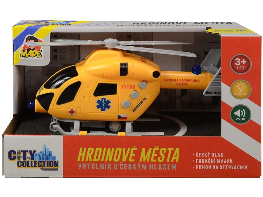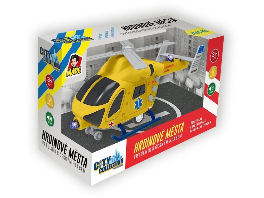 Gelbėjimo sraigtasparnis iš čekų prekės ženklo MaDe džiugina realistišku atlikimu ir čekų kalbos balso efektais. Dėl inercinės pavaros, šviesos efektų ir veikiančio švyturėlio vaikams nuo 3 metų suteiks daug veiksmo pramogų. Baterijos 3× AG13 yra pakuotėje.
