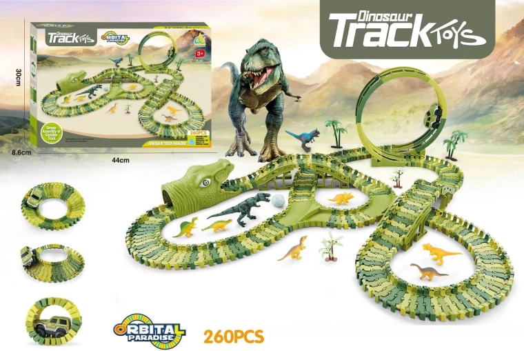 Ši spalvinga dinozaurų trasa suteiks vaikams valandų valandas pramogų ir lavins jų vaizduotę. Dėl 260 dalių trasą galima surinkti įvairiomis formomis ir aukščiais, todėl kiekvienas žaidimas vis kitoks. Komplekte yra baterijomis maitinamas automobiliukas, kuris važiuoja trasa ir skatina vaikus kūrybiškai žaisti.