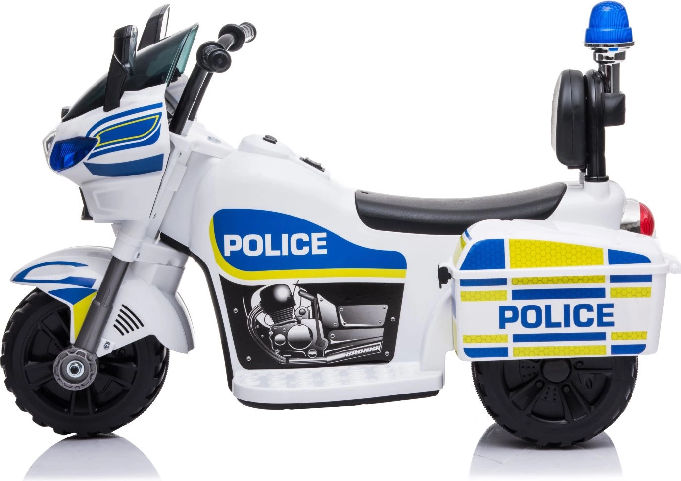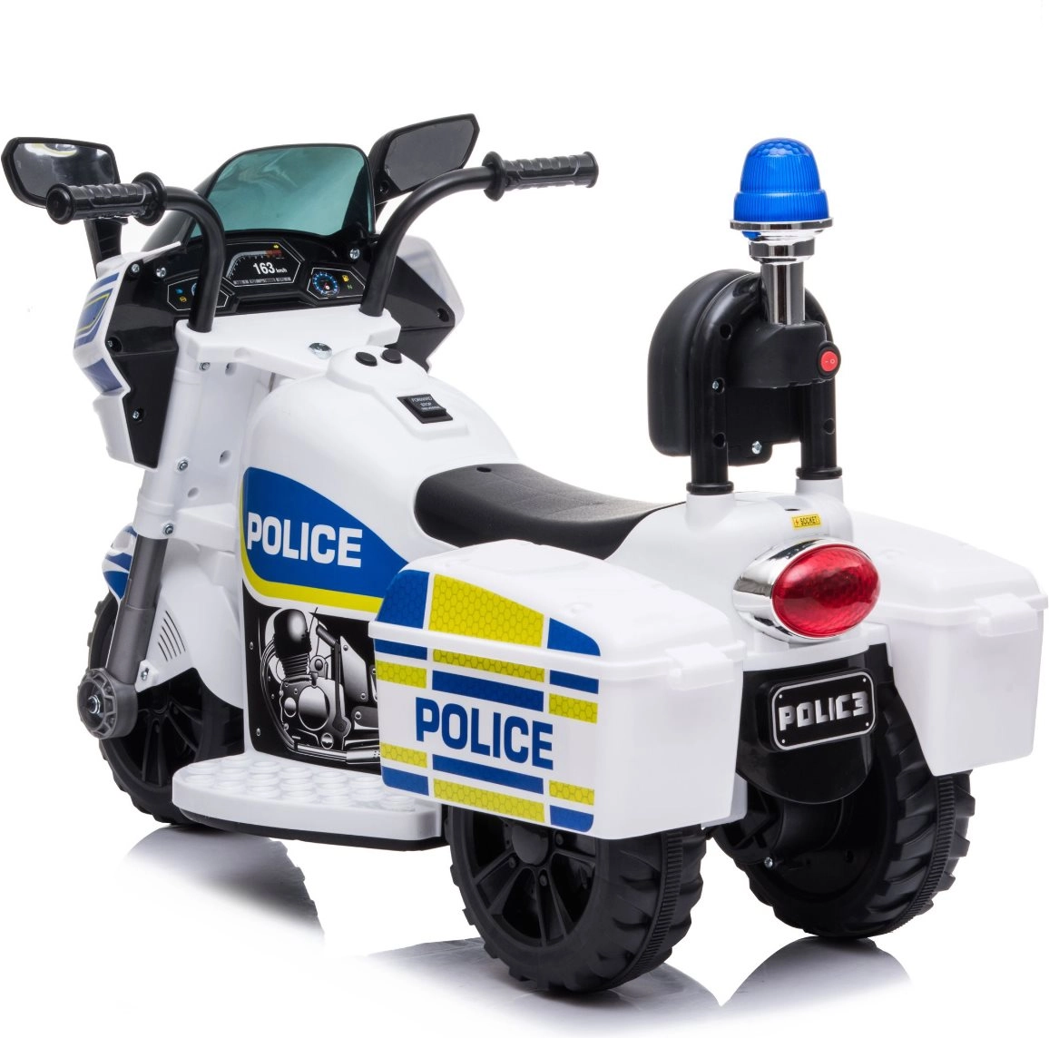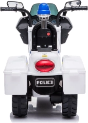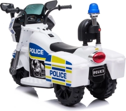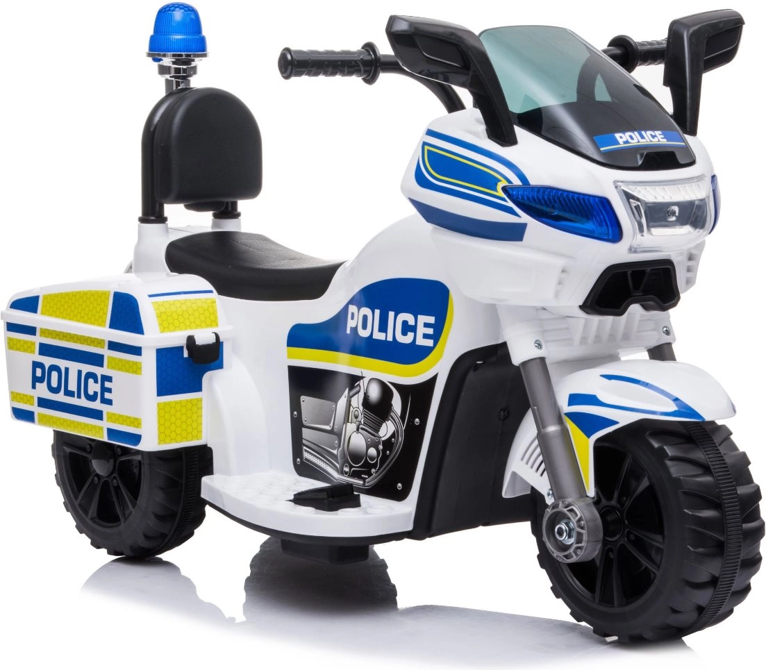 Stilingas vaikiškas elektrinis policijos motociklas baltai–mėlynos spalvos derinio suteikia realistišką policijos veiksmą su mirksinčiomis šviesomis, sirenos garsu ir paprastu važiavimo pirmyn/atgal valdymu. Stabili triračio konstrukcija, ergonomiška sėdynė su atlošu ir greitis iki 3 km/val. užtikrina saugų smagumą namuose ir lauke. Integruota MP3 įvestis, garsinis signalas ir muzikos mygtukai skatina vaidmenų žaidimus ir koordinacijos lavinimą.