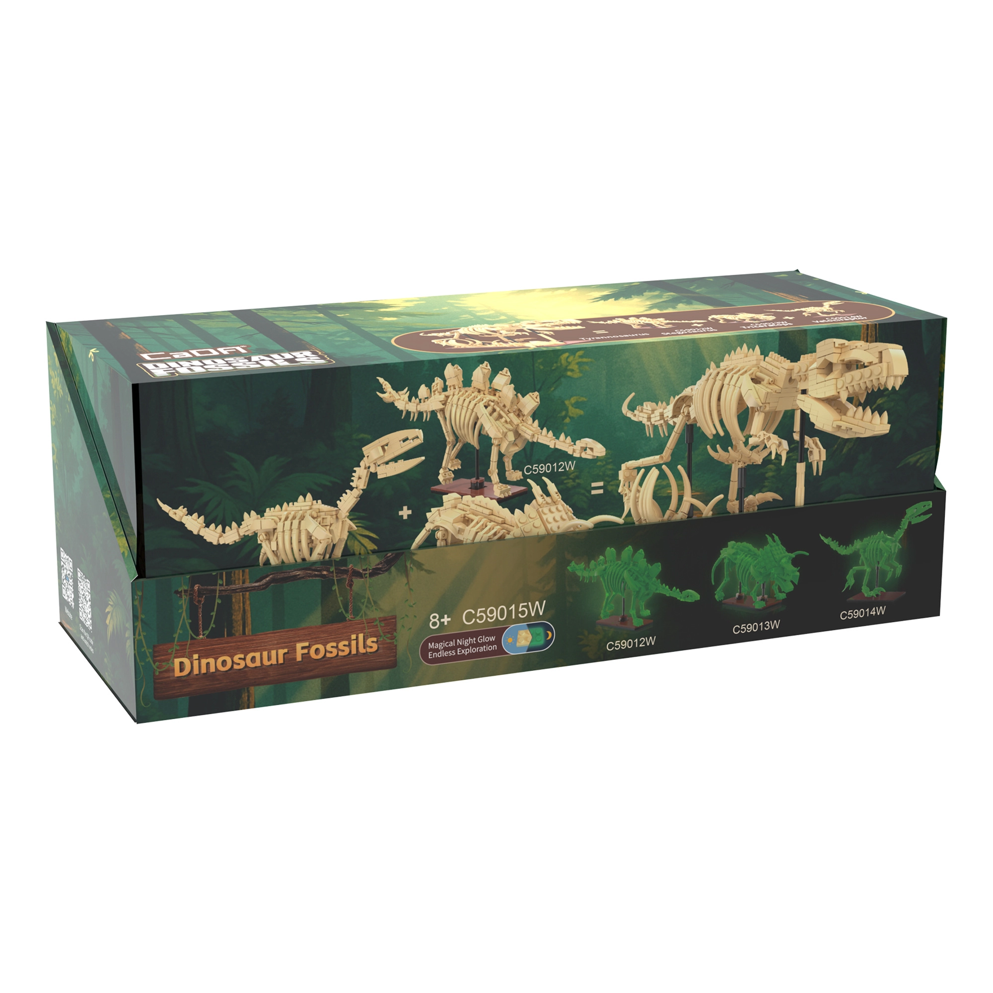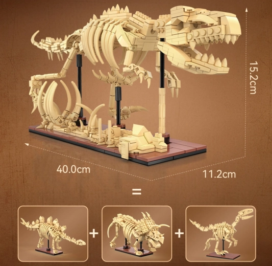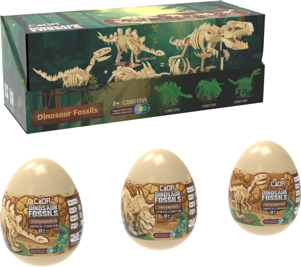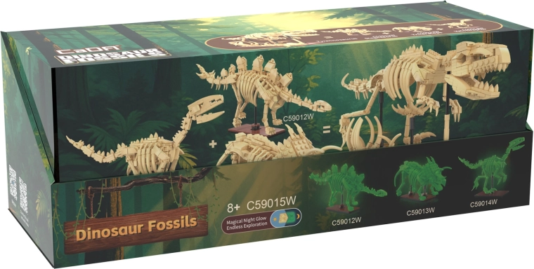 CaDA Dinosaur Fossils konstruktorius pradžiugins tiek mažus, tiek didelius priešistorės ir edukacinių modelių gerbėjus. Iš kokybiškų detalių sukursite tris įspūdingus skeletinius eksponatus su sąnariais judančiomis galūnėmis, uodega ir žandikauliu, kuriuos galite išdėstyti įvairiomis pozomis. Speciali kaulų medžiaga švyti tamsoje, todėl modeliai tampa originalia dekoracija ir sutemus.