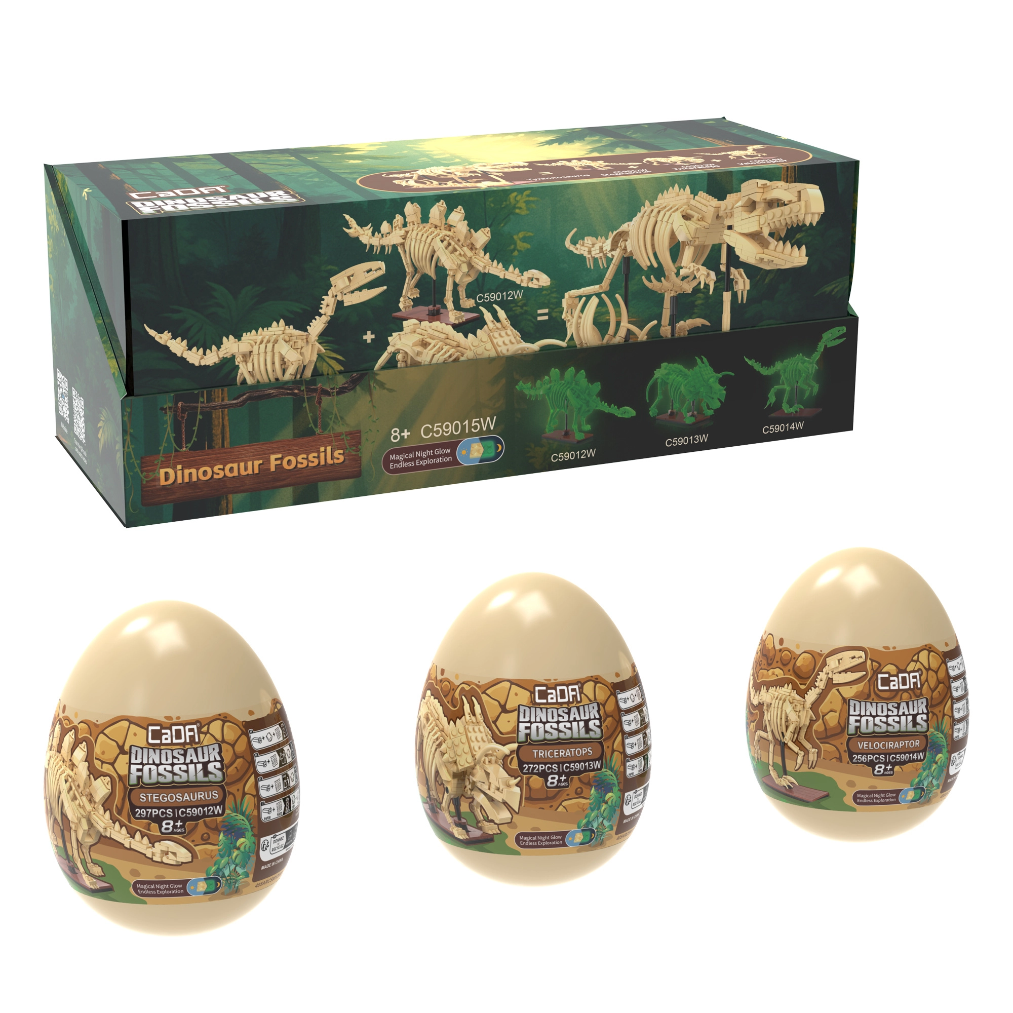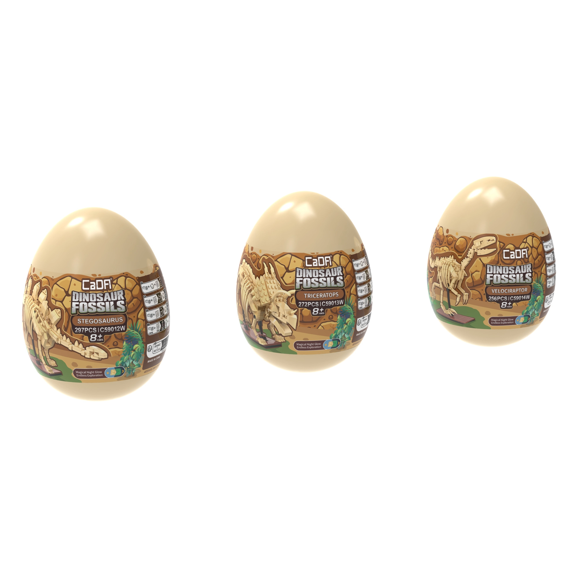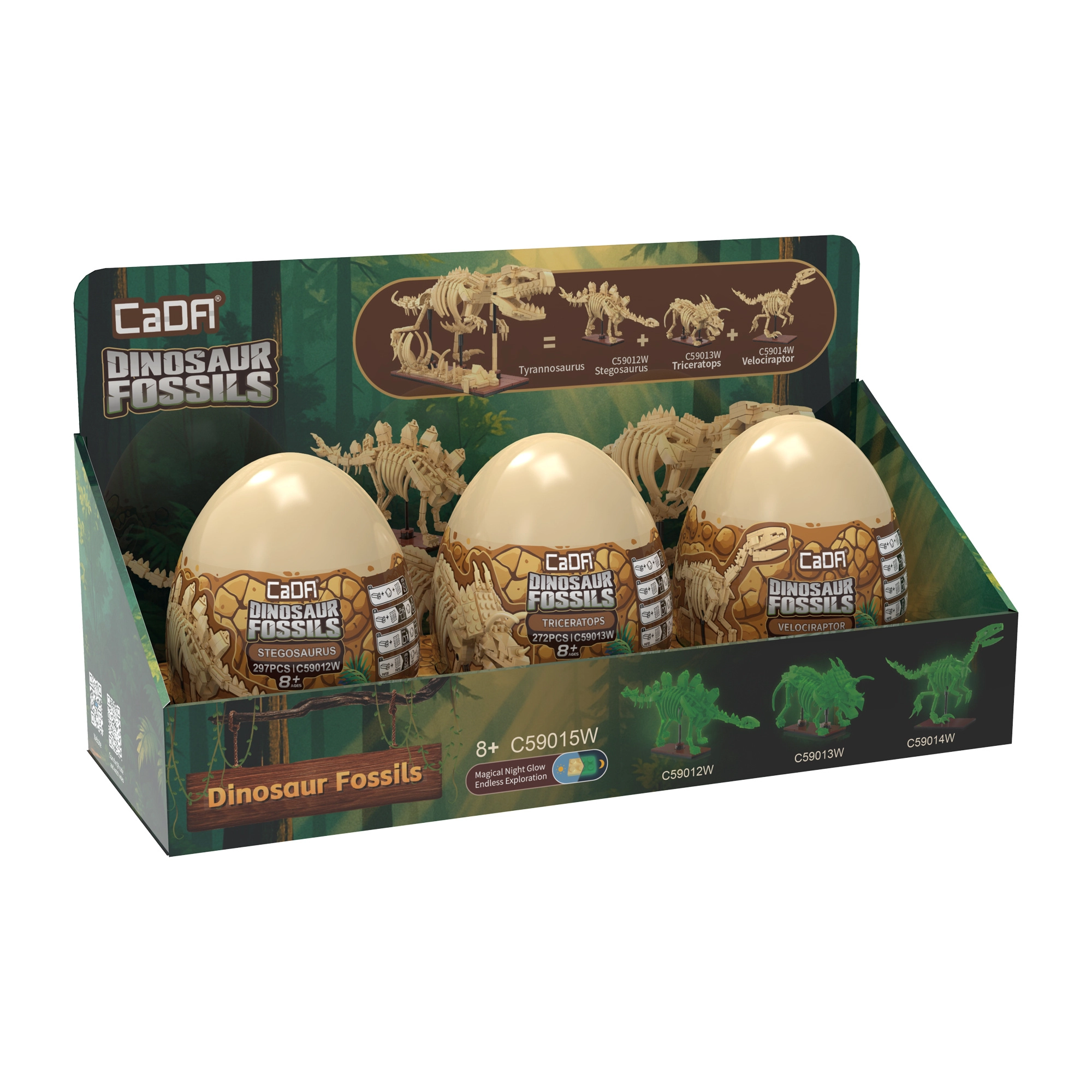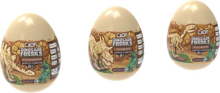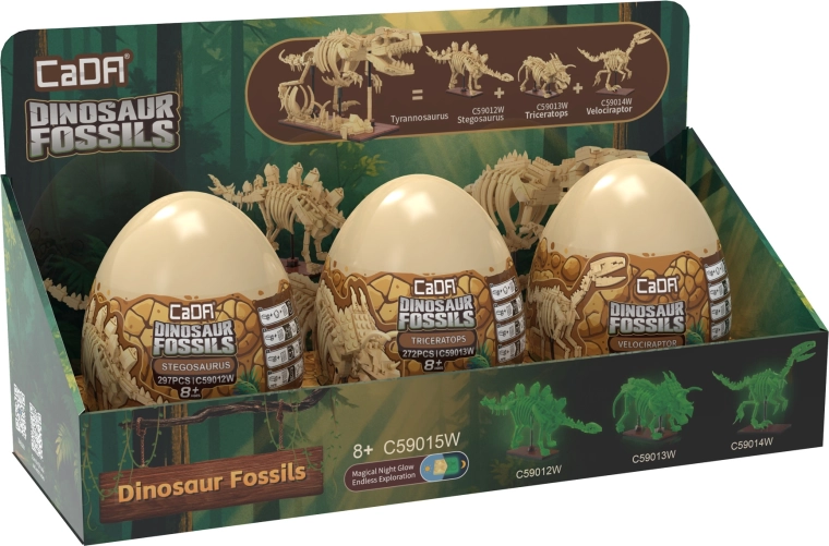 Atraskite kerintį dinozaurų pasaulį su CaDA Dinosaur Fossils konstruktoriaus rinkiniu. Surinkite tris detalius skeletinius modelius – Triceratopsą, Stegozaurą ir Velociraptorių – o vėliau juos sujunkite į įspūdingą TYRANNOSAURUS REX. Detalės turi švytėjimo tamsoje efektą, sąnariai yra judantys, o rinkinyje iš viso yra 825 suderinamos detalės patogiuose kolekciniuose „kiaušiniuose“.