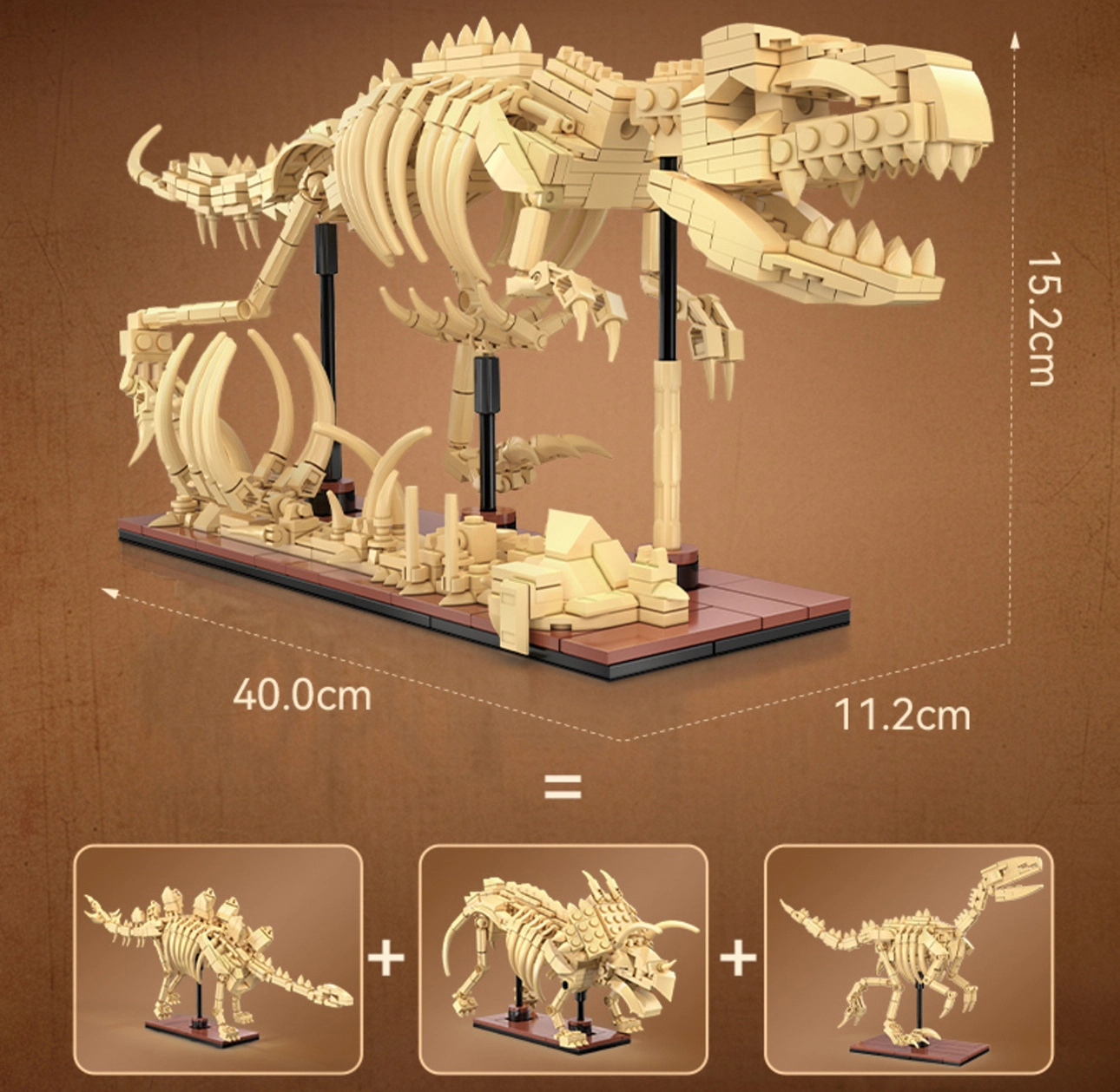 - Triceratopsas: 24 × 12,8 × 9,6 cm; Stegozauras: 38,4 × 14,4 × 8 cm; Velociraptorius: 26,2 × 14,1 × 7,2 cm