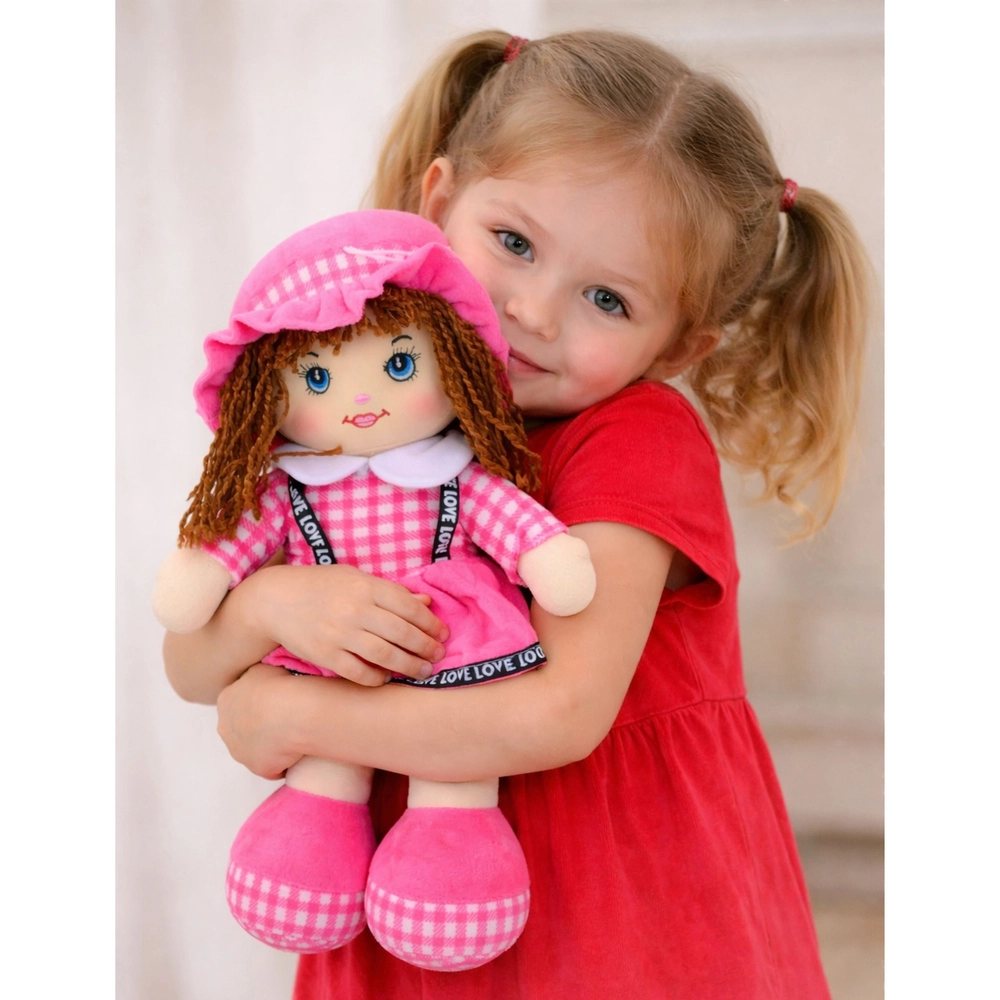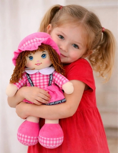 Ši švelni lėlė su rožine languota suknele pradžiugins vaikus nuo ankstyvo amžiaus. Dėl lengvos ir minkštos konstrukcijos ją lengva laikyti, nešioti ir apkabinti, taip skatinant saugumo jausmą ir emocinės raidos stiprinimą. Trumpi siūliniai plaukeliai, išsiuvinėtos akys ir šypsena suteikia lėlei mielą išraišką ir užtikrina saugų žaidimą be aštrių elementų.