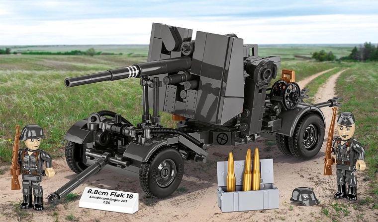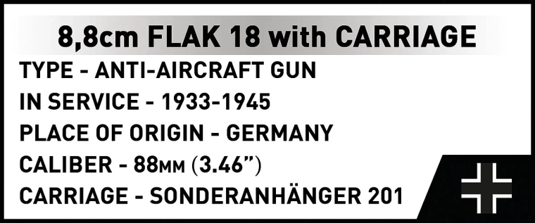 Ši klasikinė garsios patrankos 8,8 cm FLAK 18 versija pateikia autentišką modelį su išdirbtomis detalėmis ir funkcionaliais elementais ekspozicijai bei žaidimui. Kryžminė lafeta leidžia greitai sukti 360° kampu ir realistiškai nusitaikyti, pabrėžiant techninį šios Antrojo pasaulinio karo ikonos elegantiškumą.