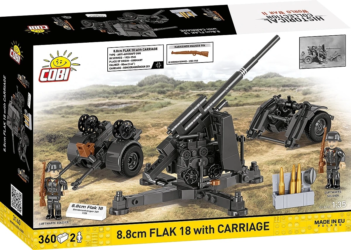 Pastatykite legendinę vokišką patranką 8,8 cm FLAK 18 su detaliu vežimėliu ir priedais. Konstruktorius iš 360 detalių siūlo realistišką atlikimą, reguliuojamą pakėlimą ir stabilų kryžminį pagrindą – idealu kolekcionieriams, istorijos gerbėjams ir konstruktorių mėgėjams.