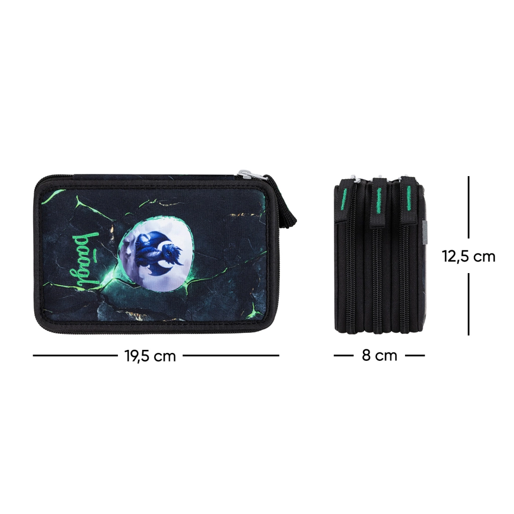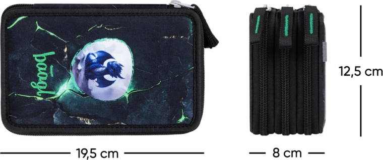 Stilingas BAAGL mokyklinis penalas su drakono motyvu siūlo ypač erdvius tris skyrius, patikimus YKK užtrauktukus ir tvirtas gumas net storoms pieštukinėms kreidelėms ir flomasteriams. Dėl sutvirtintos nugarėlės jį lengva atidaryti ir uždaryti. Penalas be reikmenų, paruoštas tiksliai jūsų priemonėms.
