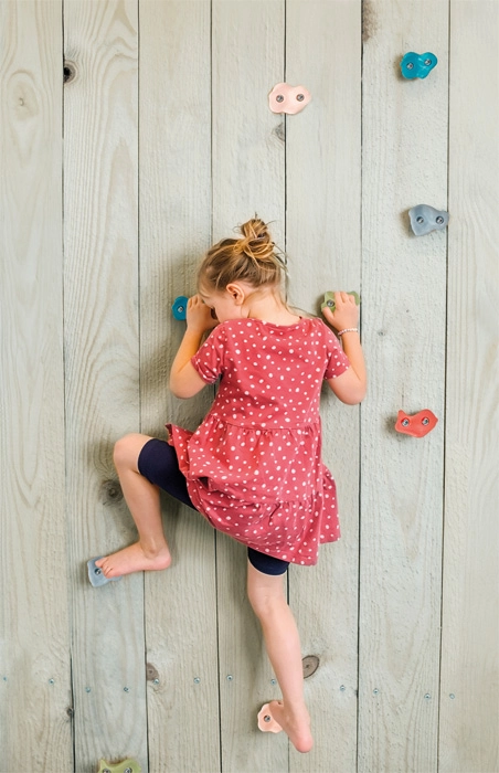 Dėl laisvo išdėstymo lengvai pritaikysite sudėtingumą – nuo paprastų pradedančiųjų linijų iki sudėtingesnių iššūkių mažiesiems boulderingo entuziastams. Laipiojimas natūraliai lavina jėgą, ištvermę, koordinaciją ir pasitikėjimą savimi bei skatina sveiką vaikų motorinę raidą.
