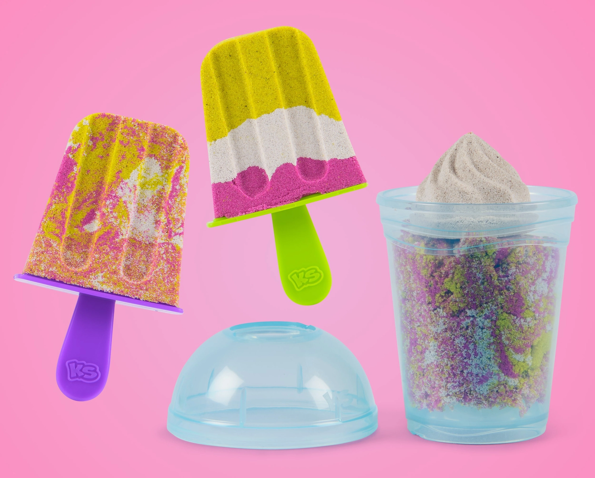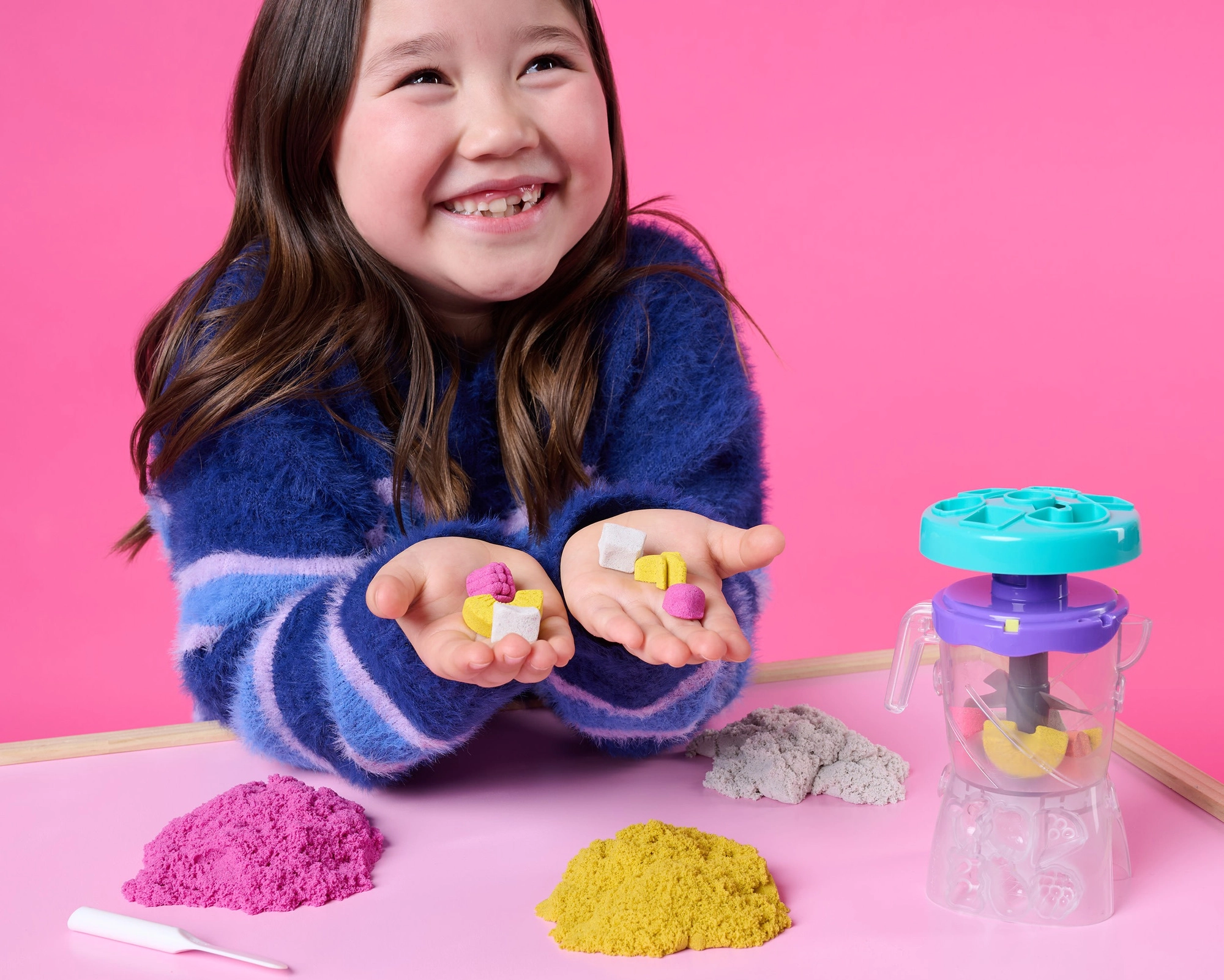 Su Kinetic Sand smoothie maišytuvu vaikai mokosi maišyti spalvas ir sluoksniuoti „gėrimus“ bei „desertus“ į puodelius ar ledų formeles. Tereikia suberti smėlį į maišytuvo dangtį, ranka pasukti ir stebėti, kaip gimsta nauji atspalviai bei tikroviškos tekstūros. Kinetinis smėlis atrodo lyg drėgnas, tačiau rankos išlieka sausos, o darbo paviršius – švaresnis.