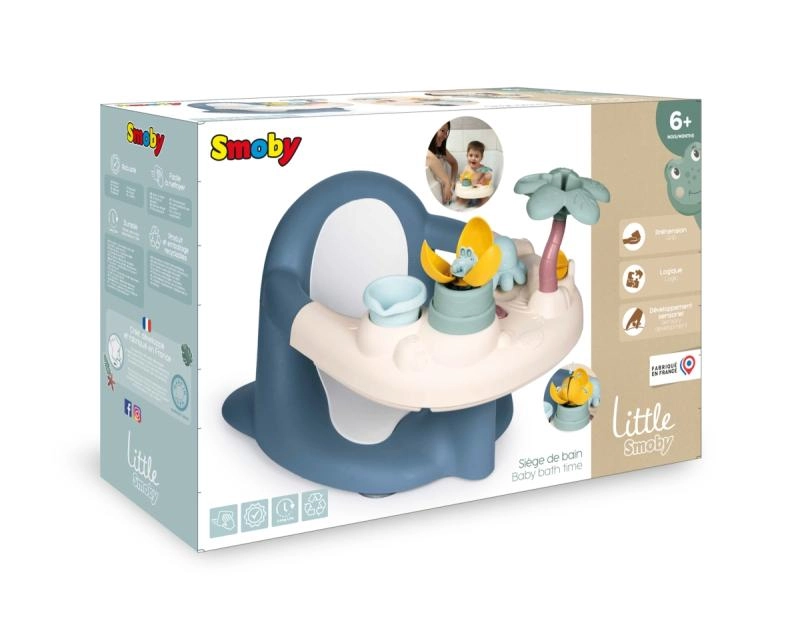 Komplekte yra interaktyvus žaidimų pultelis su 5 vandens veiklomis, kurios lavina pojūčius ir smulkiąją motoriką: vandens malūnėlis, pylimui skirtas puodelis, palmės purkštuvas, „stebuklinga“ gėlė ir vandenį purškianti aštuonkojė. Keturios stiprios siurbtukai tvirtai laiko kėdutę vonios dugne užtikrindami maksimalų stabilumą. Pagaminta Prancūzijoje.