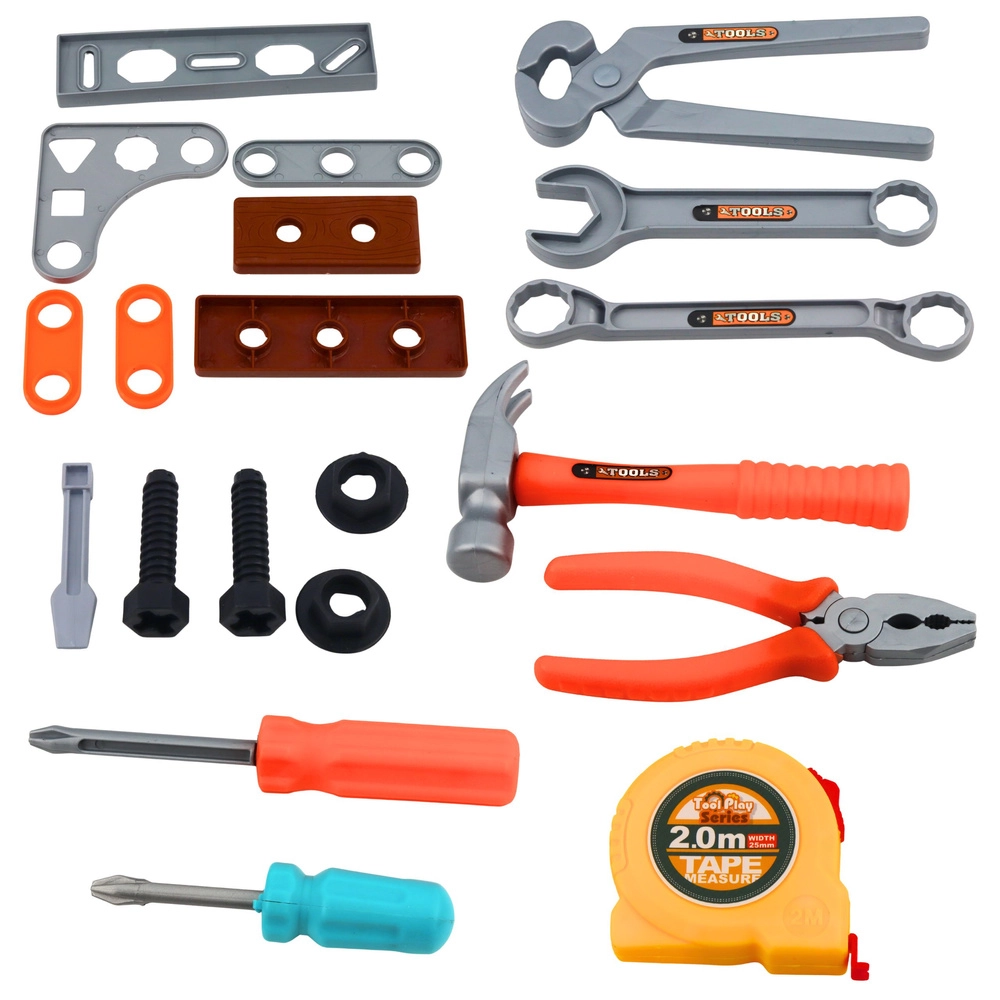 Rankinis pjūklas, plaktukas, atsuktuvai, raktai ir matuoklis praplečia žaidimo galimybes ir lavina smulkiąją motoriką.
