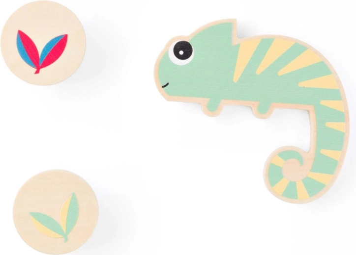 Linksmas medinis žaidimas 2–10 žaidėjų nuo 4 metų, kuriame bandote pergudrauti chameleoną ir rasti lapą, po kuriuo jis nepaslėps. Vaikai kelia apvalius medinius žetonus su lapais ir ieško tokių, kurie turi dvi spalvas, kurių chameleonas neturi. Žaidimas siūlo tris sudėtingumo lygius, lavina atmintį ir pastabumą, o dėl kokybiškos gamybos iš medienos iš atsakingai tvarkomų miškų tarnaus daugelį metų.