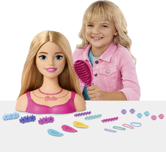 Elegantiškas biustas su rožiniais marškinėliais ir BARBĖS vėriniu atrodo realistiškai ir kviečia į kūrybišką mažųjų kirpėjų žaidimą.
