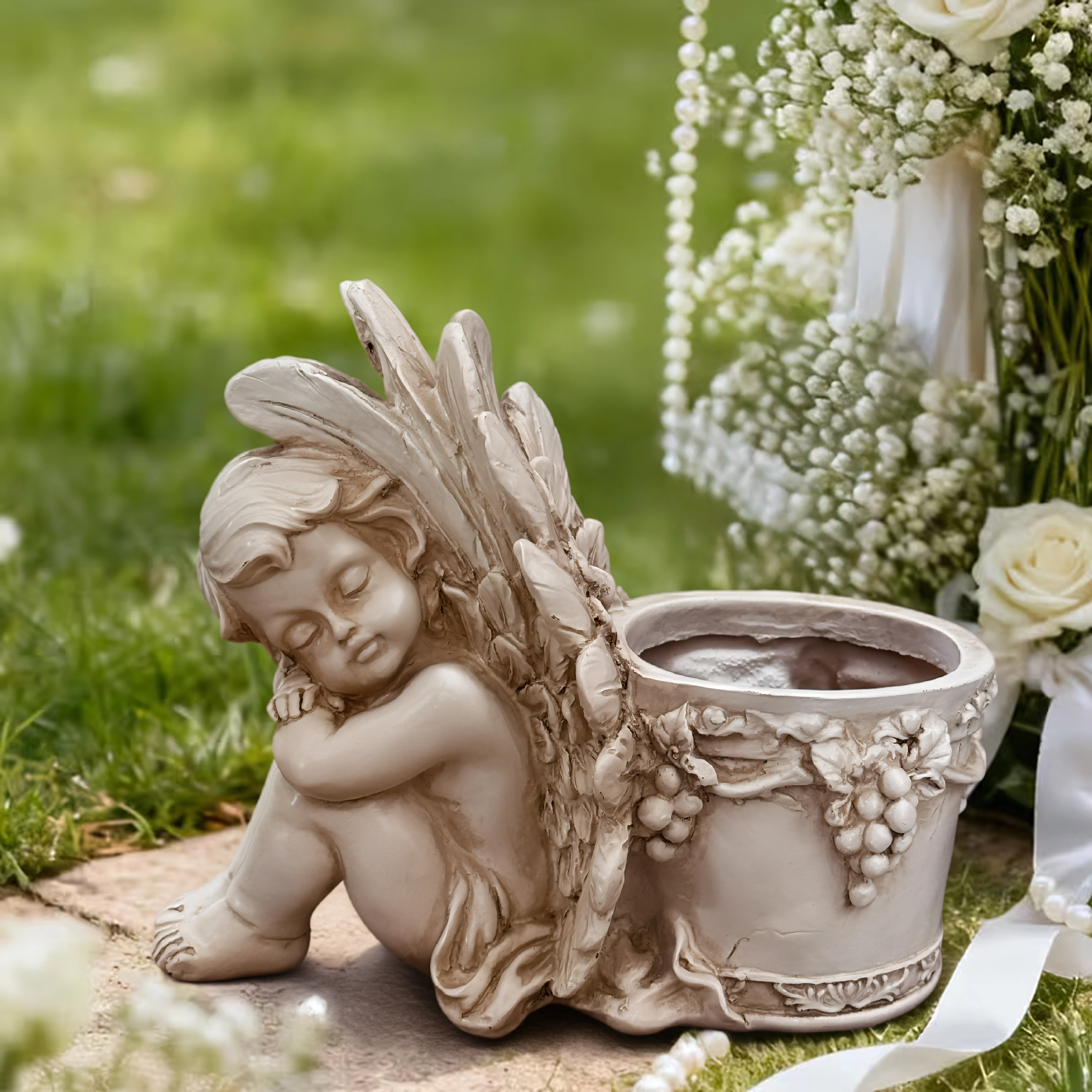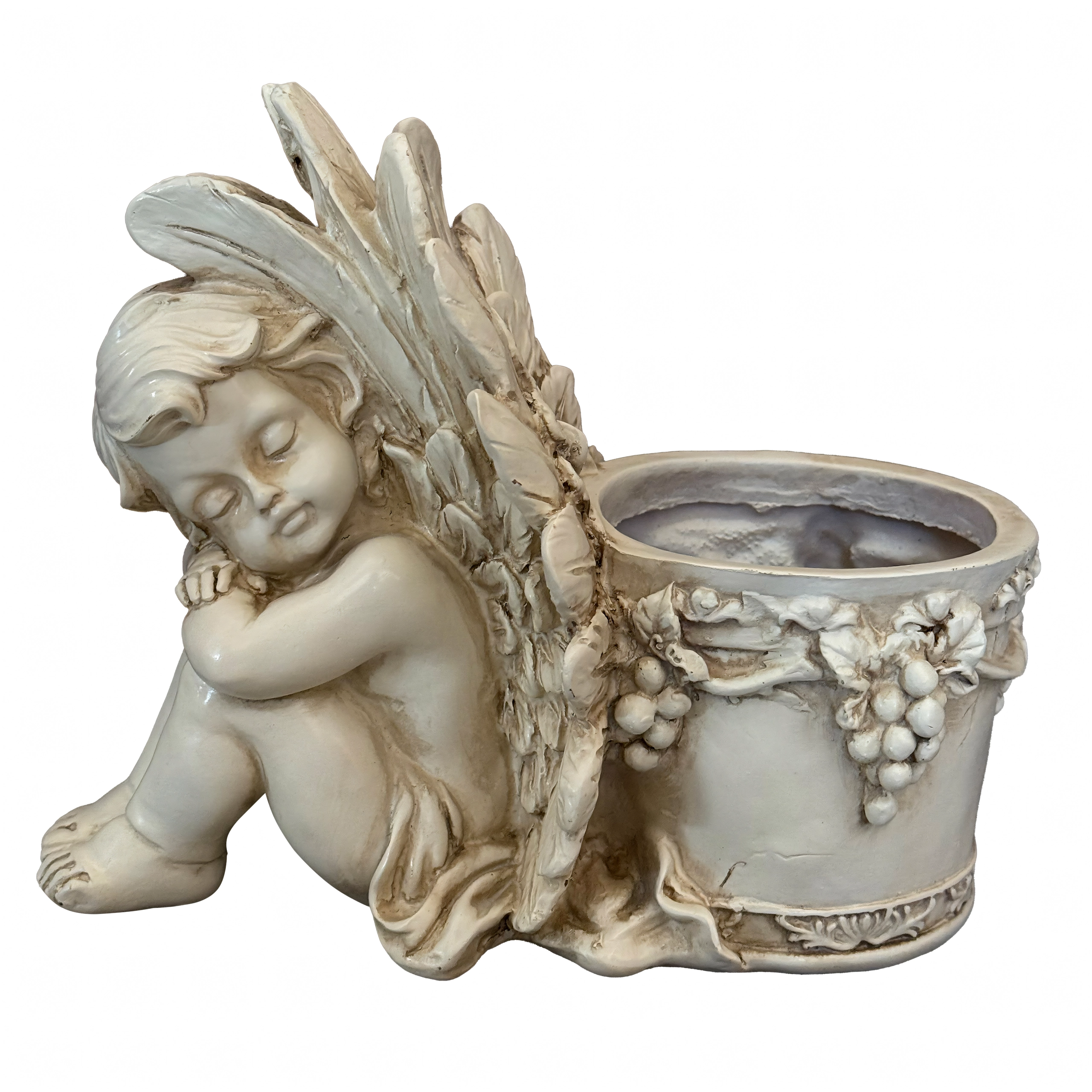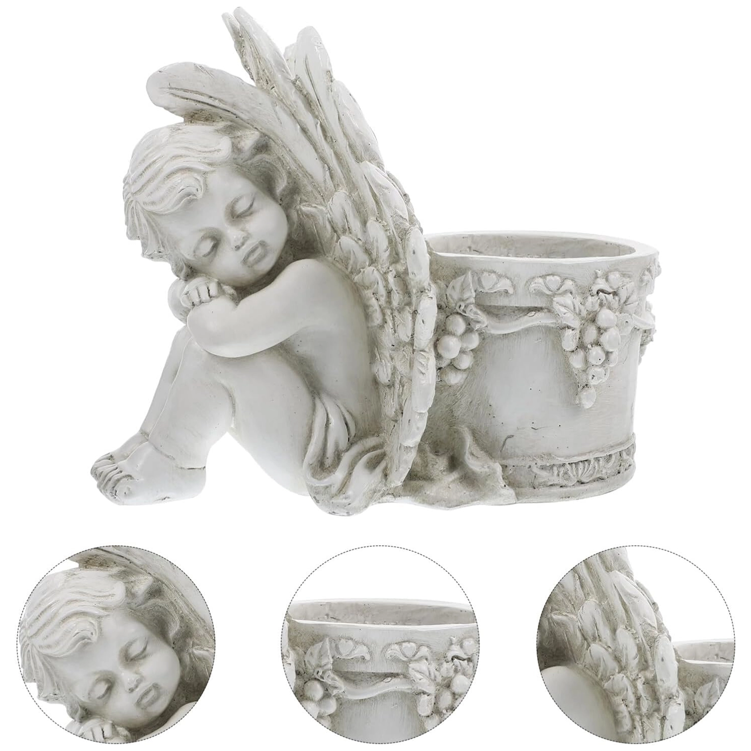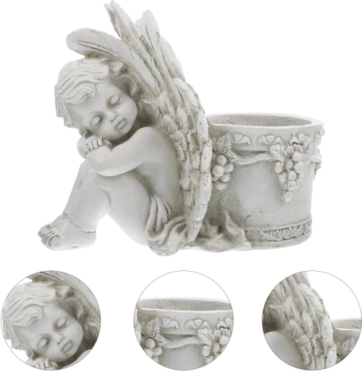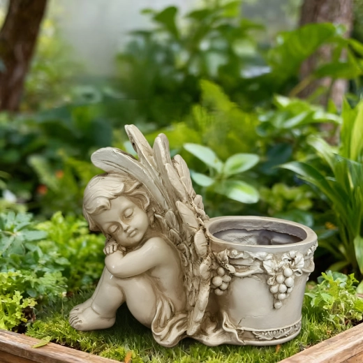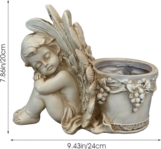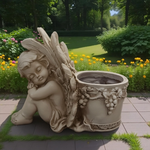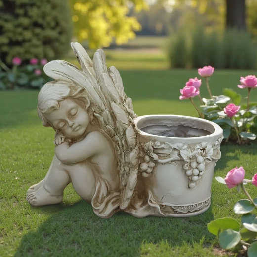 Šis stilingas vazonas su miegančio angelėlio skulptūrėle sujungia dekoracijos žavesį ir augalų indo funkcionalumą. Angelėlio kūnas su subtiliai išdirbtais sparnais remiasi į apvalų vazoną, puoštą vynuogių vijoklio motyvais, pabrėžiančiais antikinę, akmeninę išvaizdą. Puikiai tinka tiek interjerui, tiek eksterjerui – ant palangės, balkone, terasoje ar sodo kampelyje.