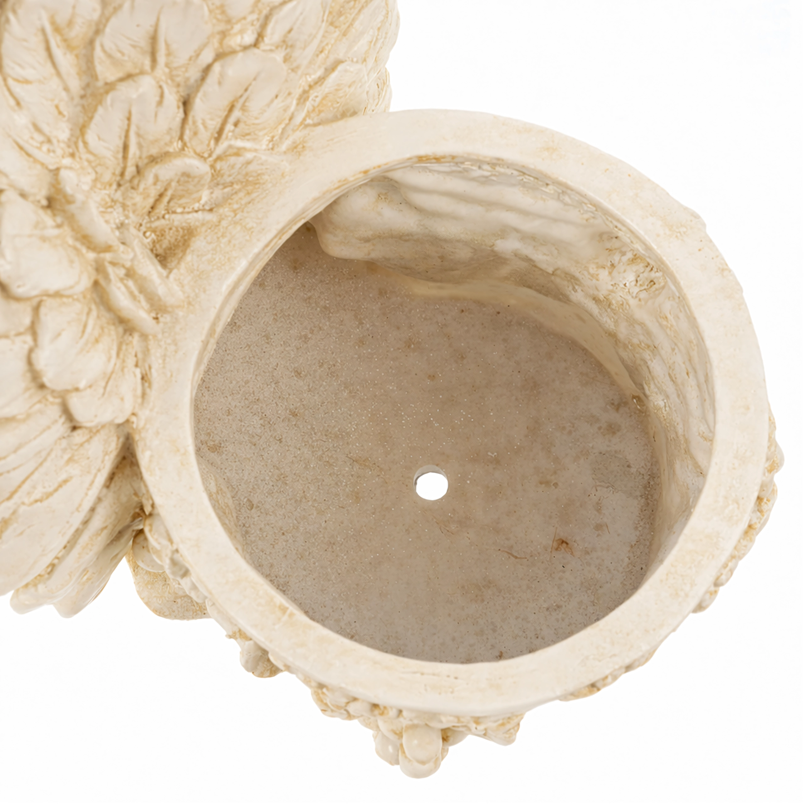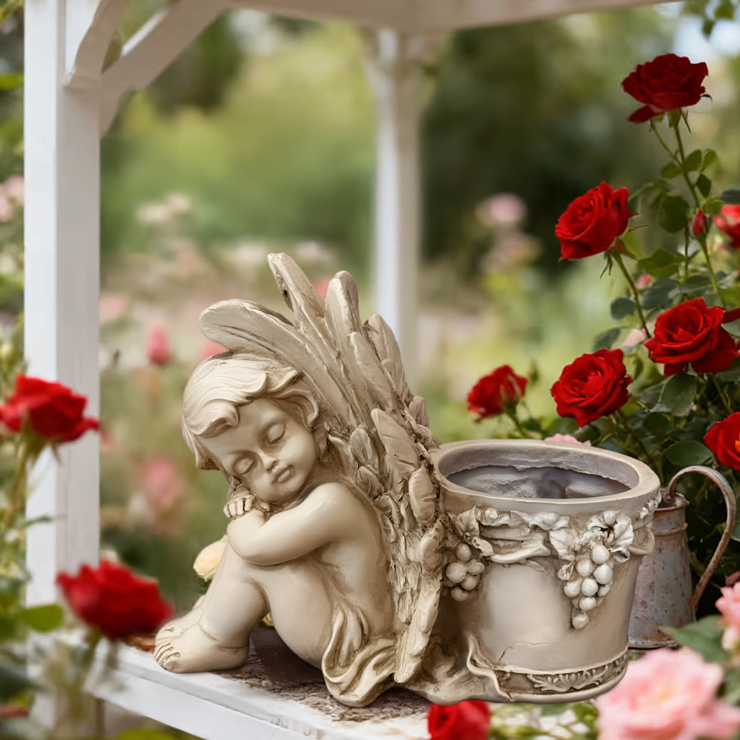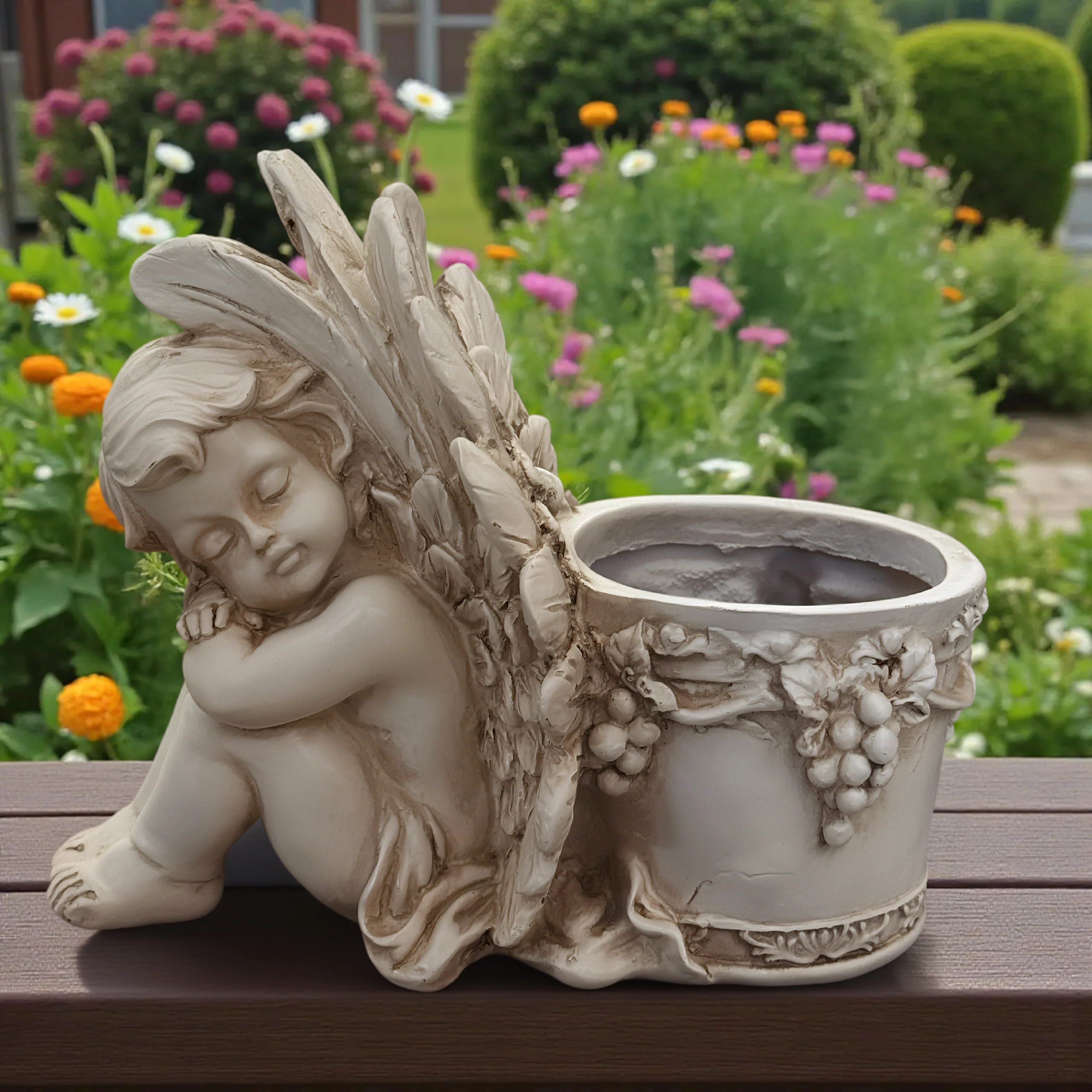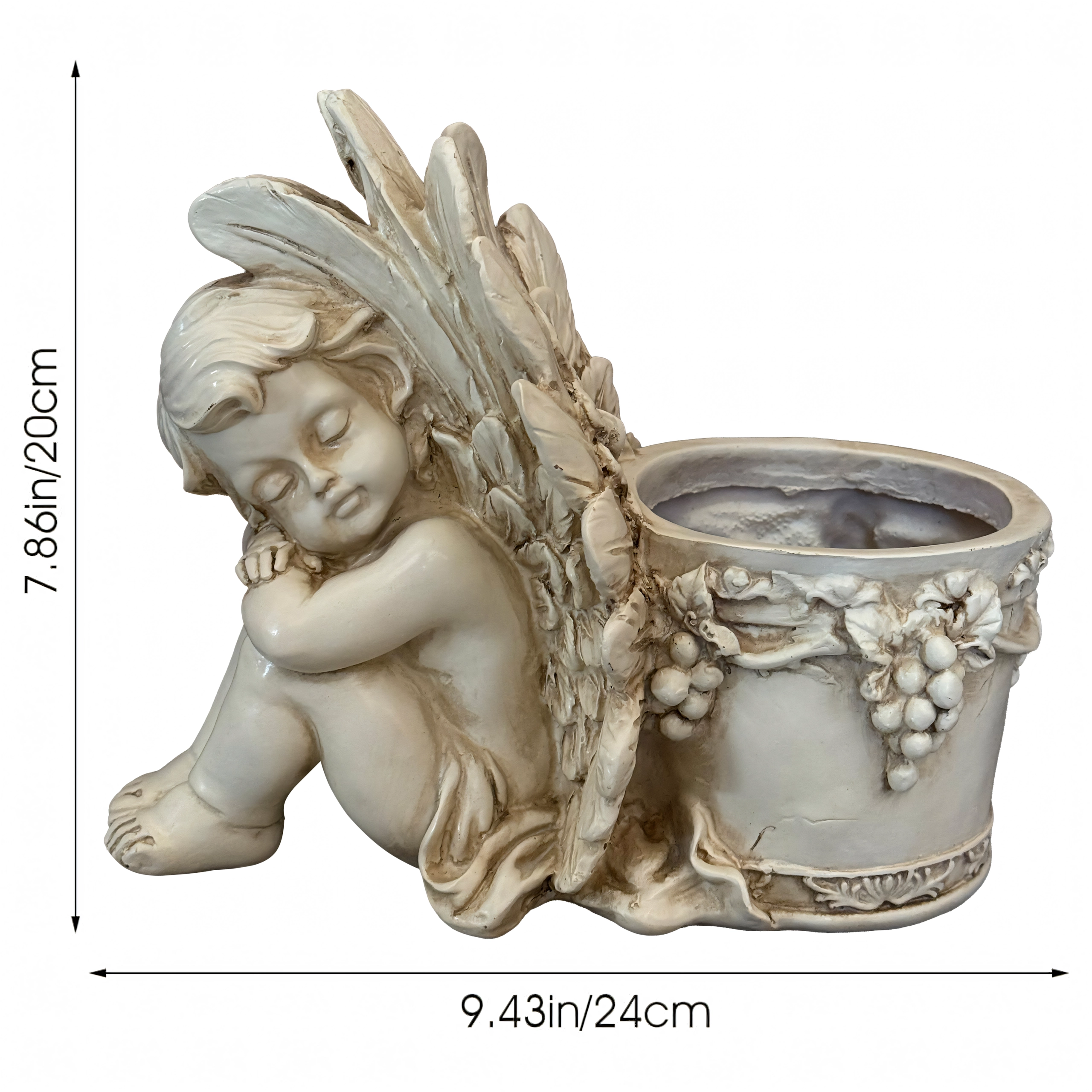 Šis stilingas vazonas su miegančio angelėlio skulptūrėle sujungia dekoracijos žavesį ir augalų indo funkcionalumą. Angelėlio kūnas su subtiliai išdirbtais sparnais remiasi į apvalų vazoną, puoštą vynuogių vijoklio motyvais, pabrėžiančiais antikinę, akmeninę išvaizdą. Puikiai tinka tiek interjerui, tiek eksterjerui – ant palangės, balkone, terasoje ar sodo kampelyje.