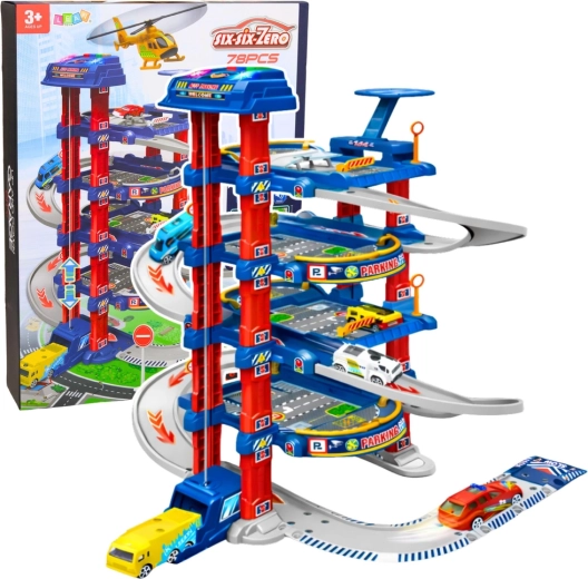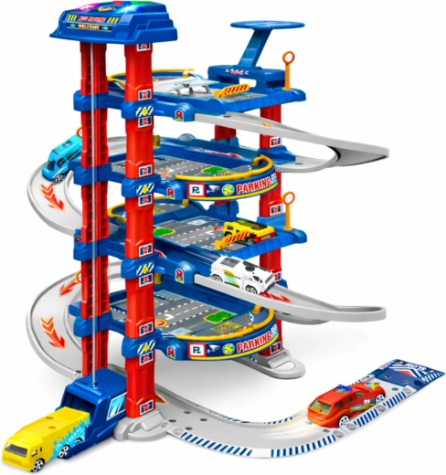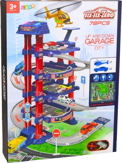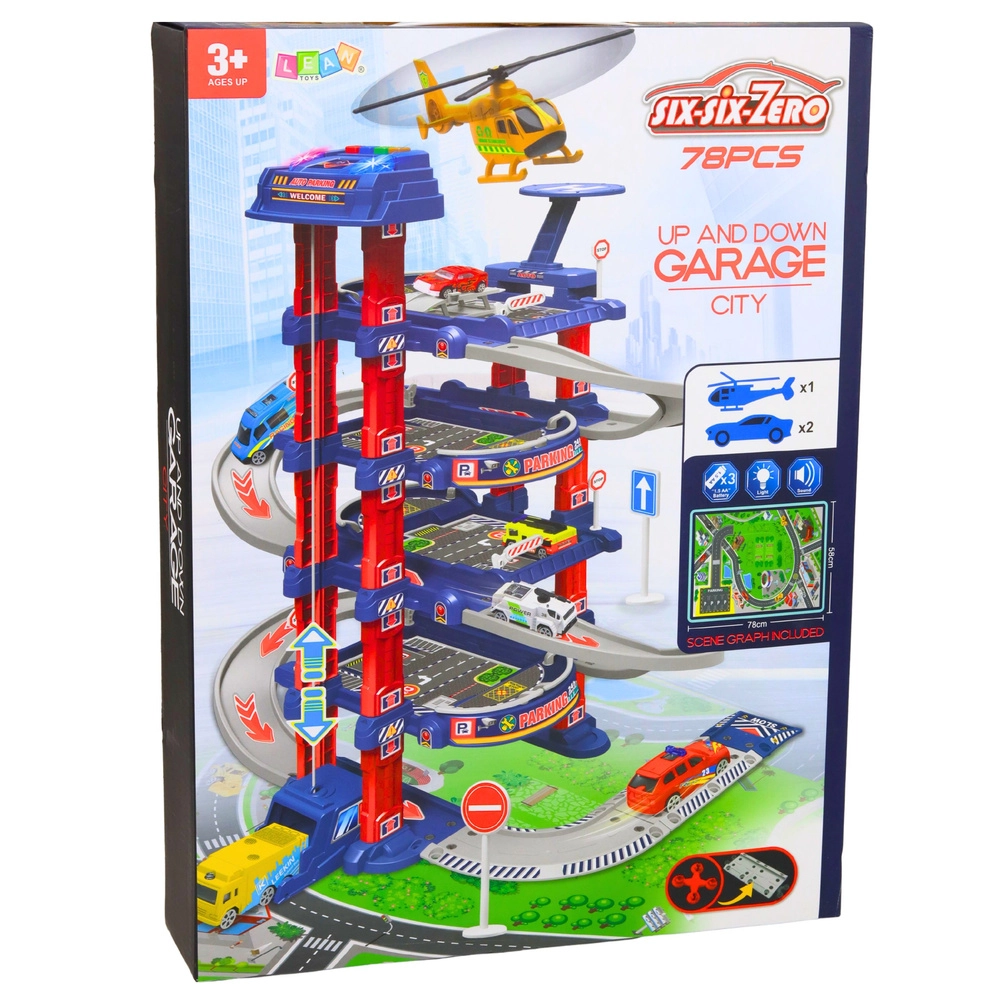 Didelė vaikų stovėjimo aikštelė sukurta mažiesiems automobiliukų ir miesto eismo mėgėjams. Elektrinis liftas lengvai pakelia automobiliukus į aukštesnius aukštus, iš kurių jie gali leistis nuožulnia trasa. Komplekte taip pat yra sraigtasparnio nusileidimo aikštelė, kelio ženklai ir grindų žaidimų kilimėlis, sukuriantys tikrovišką miesto aplinką.