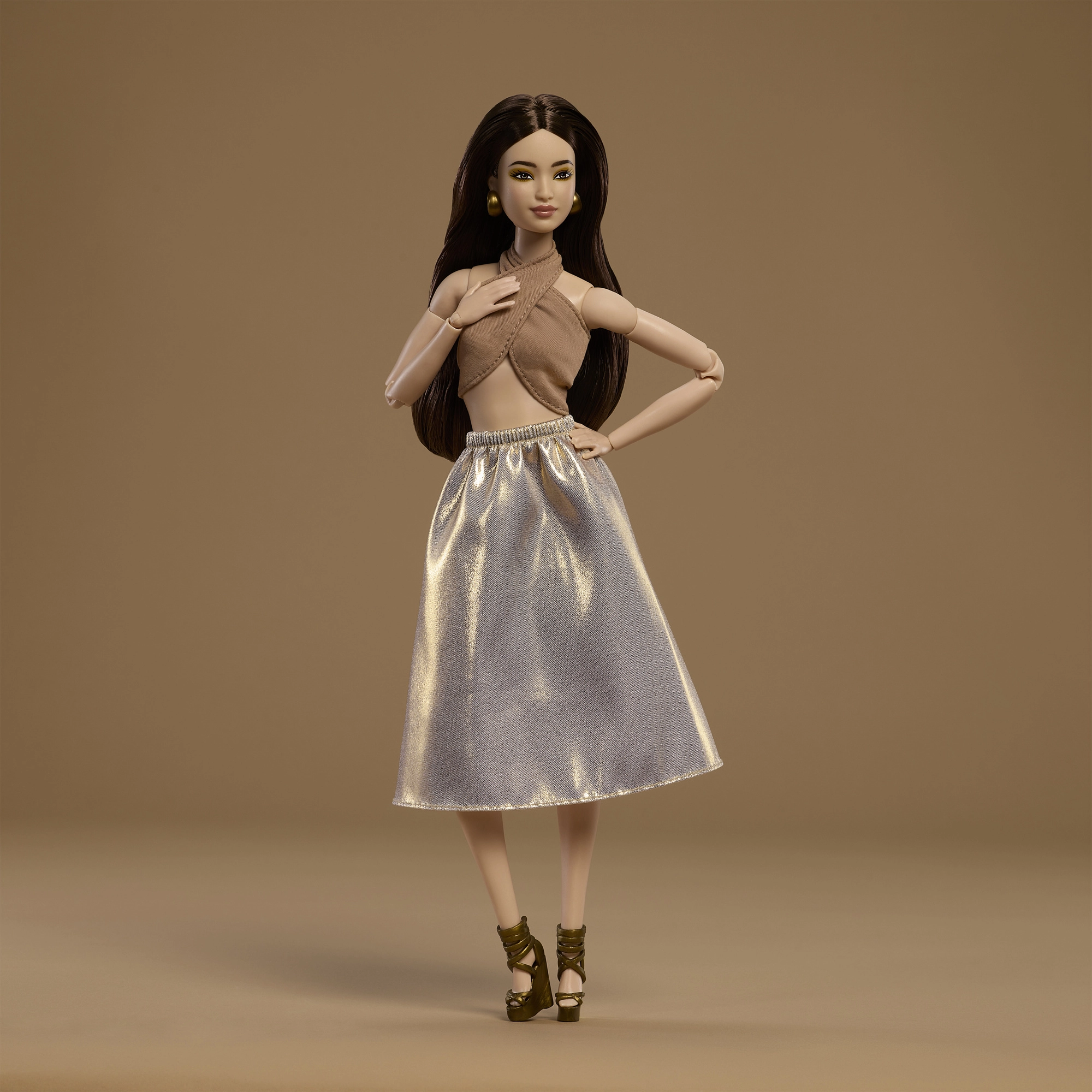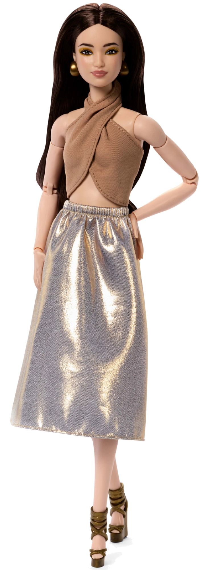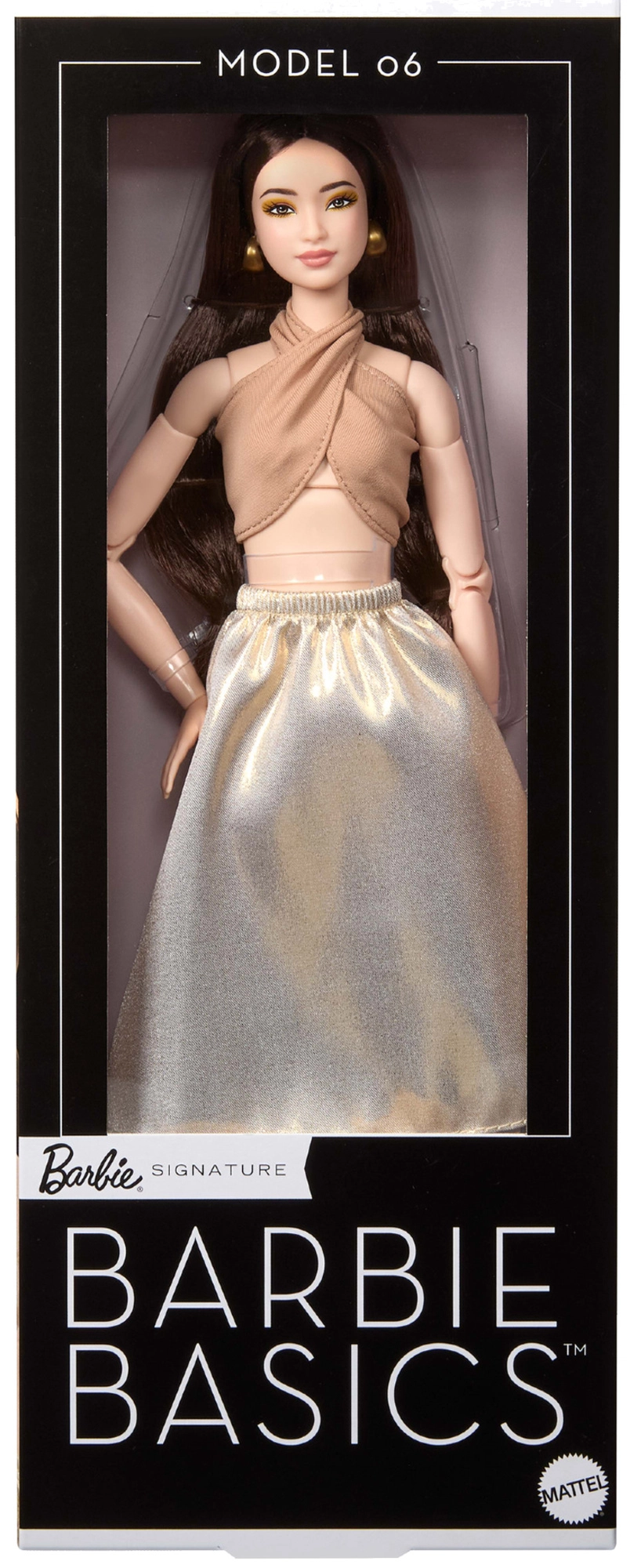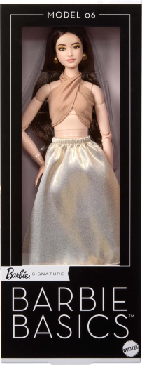 Modelis 06 iš serijos Barbie Signature Basics atneša minimalistinę eleganciją šviesiai rudos ir auksinės atspalviuose. Elegantiško topelio ir laisvo sijono derinys pabrėžia modernią, laikui nepavaldžią išvaizdą. Lėlė turi šviesią odą, liekną siluetą ir harmoningą, subtilų makiažą, kuris pabrėžia jos natūralų grožį.