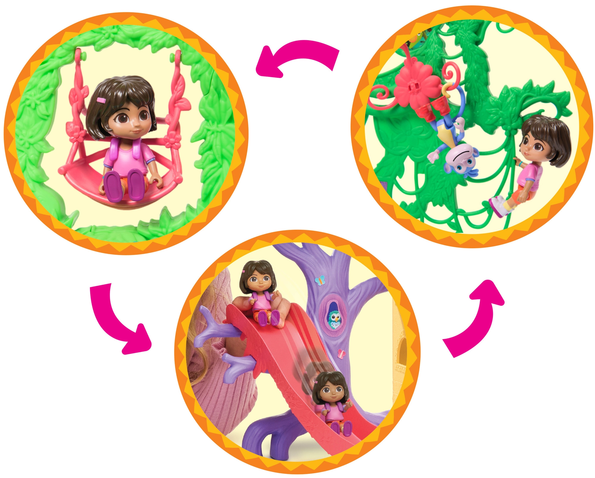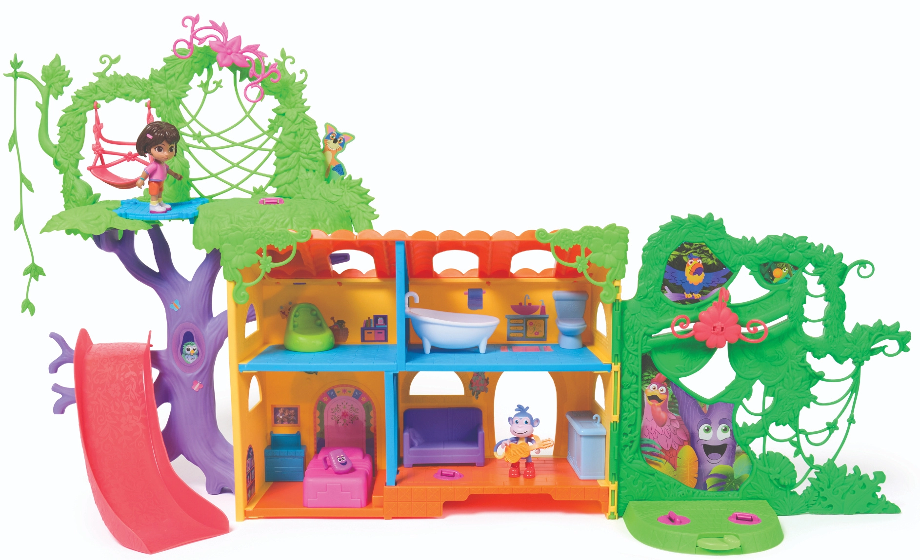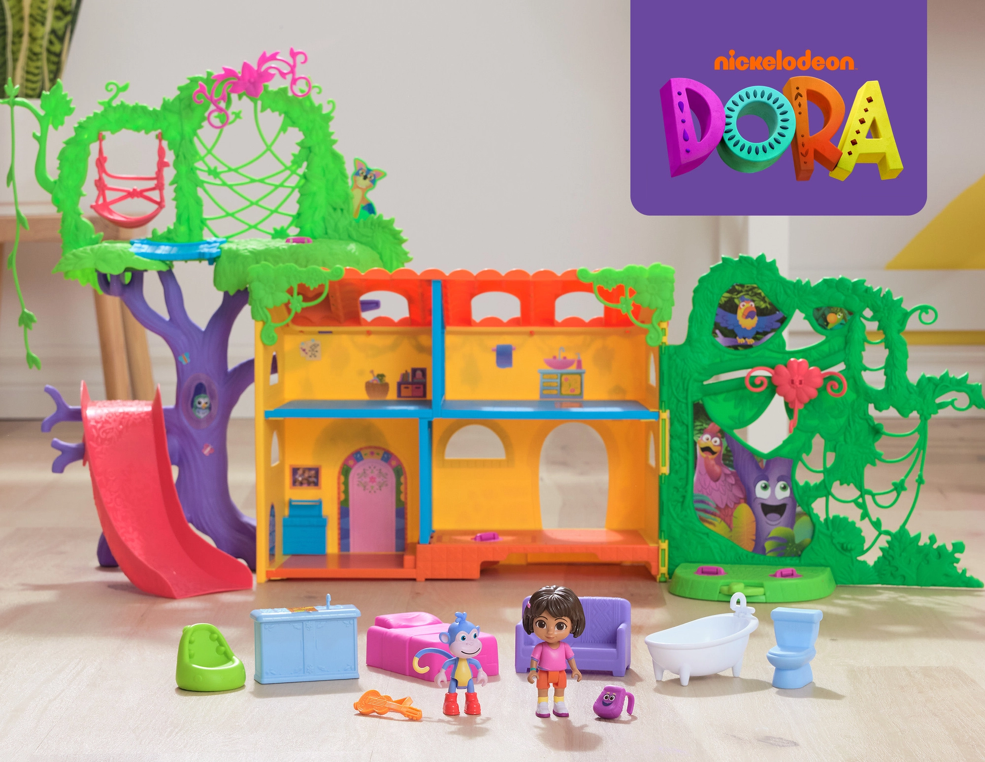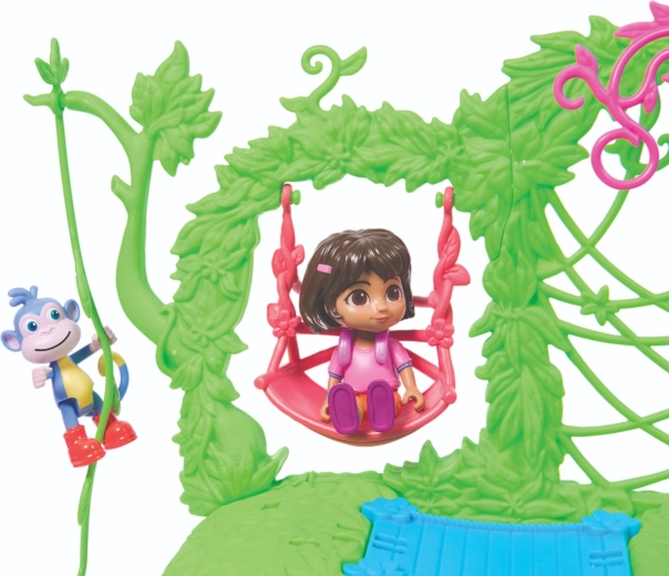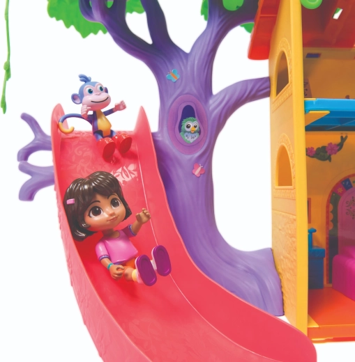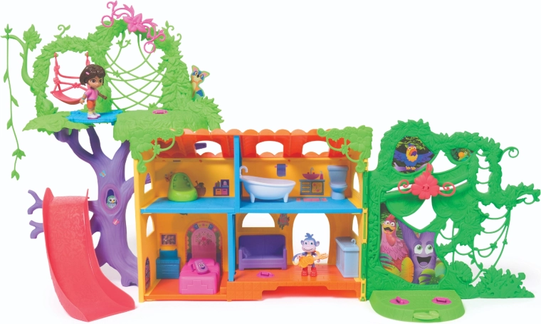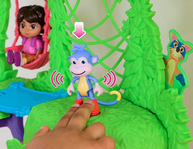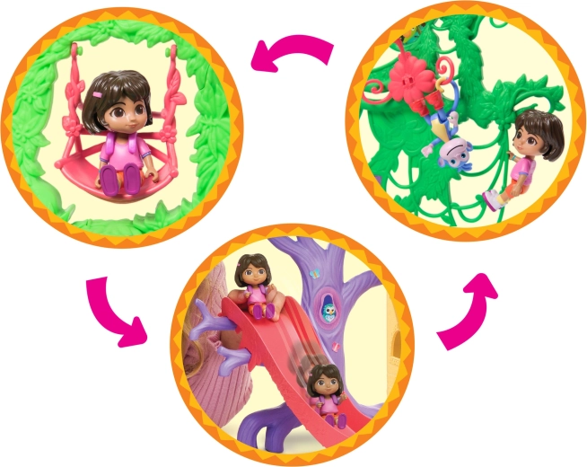 Ženkite į spalvingą džiunglių namelį, įkvėptą serialo Dora tyrinėtoja, ir leiskitės į nuotykius. Interjere yra kelios detaliai sukurtos patalpos su baldais (pvz., sofa, vonia), o eksterjere gausu pramogų medžių lajoje. Vienu mygtuko paspaudimu svetainėje įjungsite garsinius efektus ir muziką, kurie padeda interaktyviai mokytis ir smagiai leisti laiką.