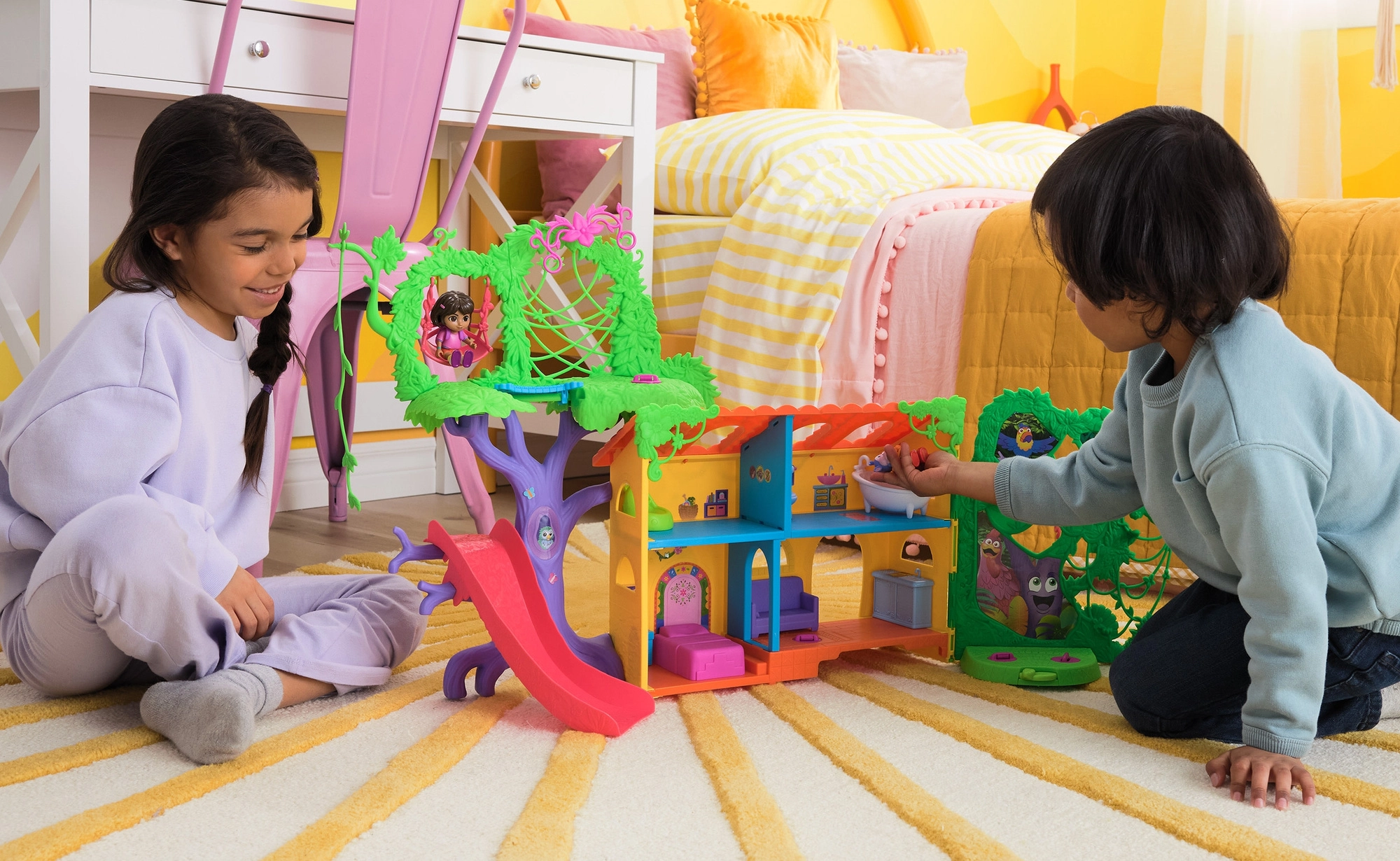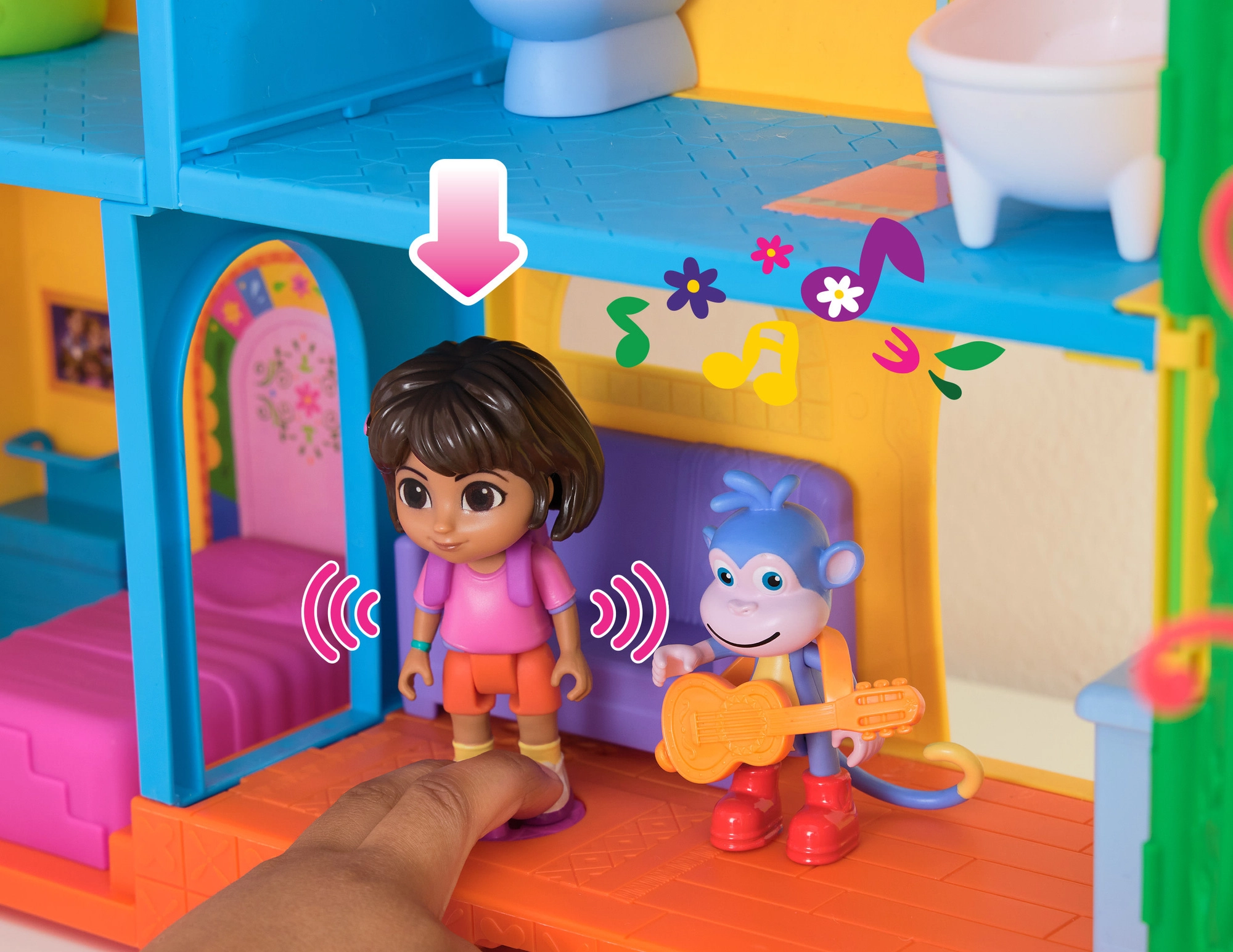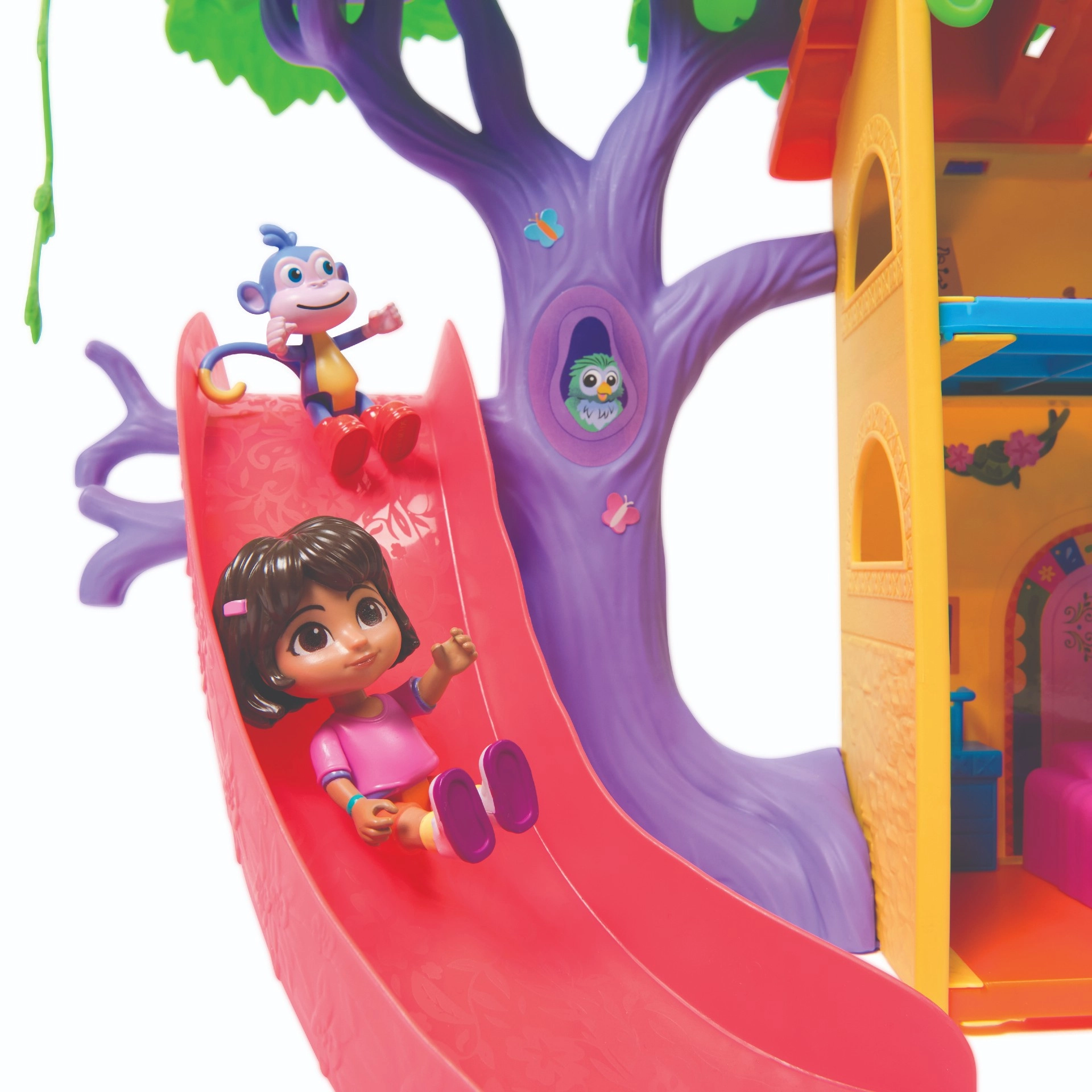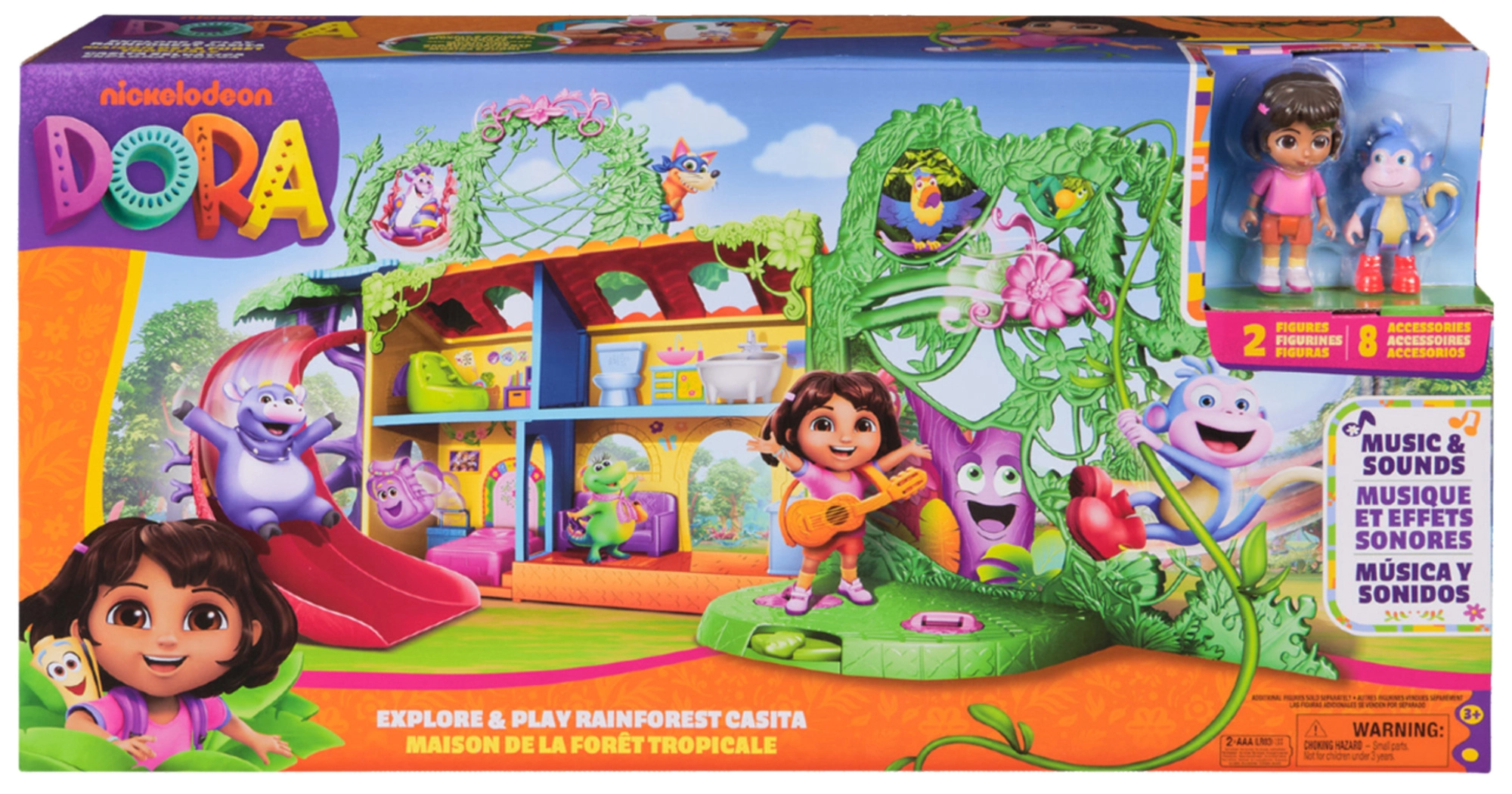 Ženkite į spalvingą džiunglių namelį, įkvėptą serialo Dora tyrinėtoja, ir leiskitės į nuotykius. Interjere yra kelios detaliai sukurtos patalpos su baldais (pvz., sofa, vonia), o eksterjere gausu pramogų medžių lajoje. Vienu mygtuko paspaudimu svetainėje įjungsite garsinius efektus ir muziką, kurie padeda interaktyviai mokytis ir smagiai leisti laiką.
