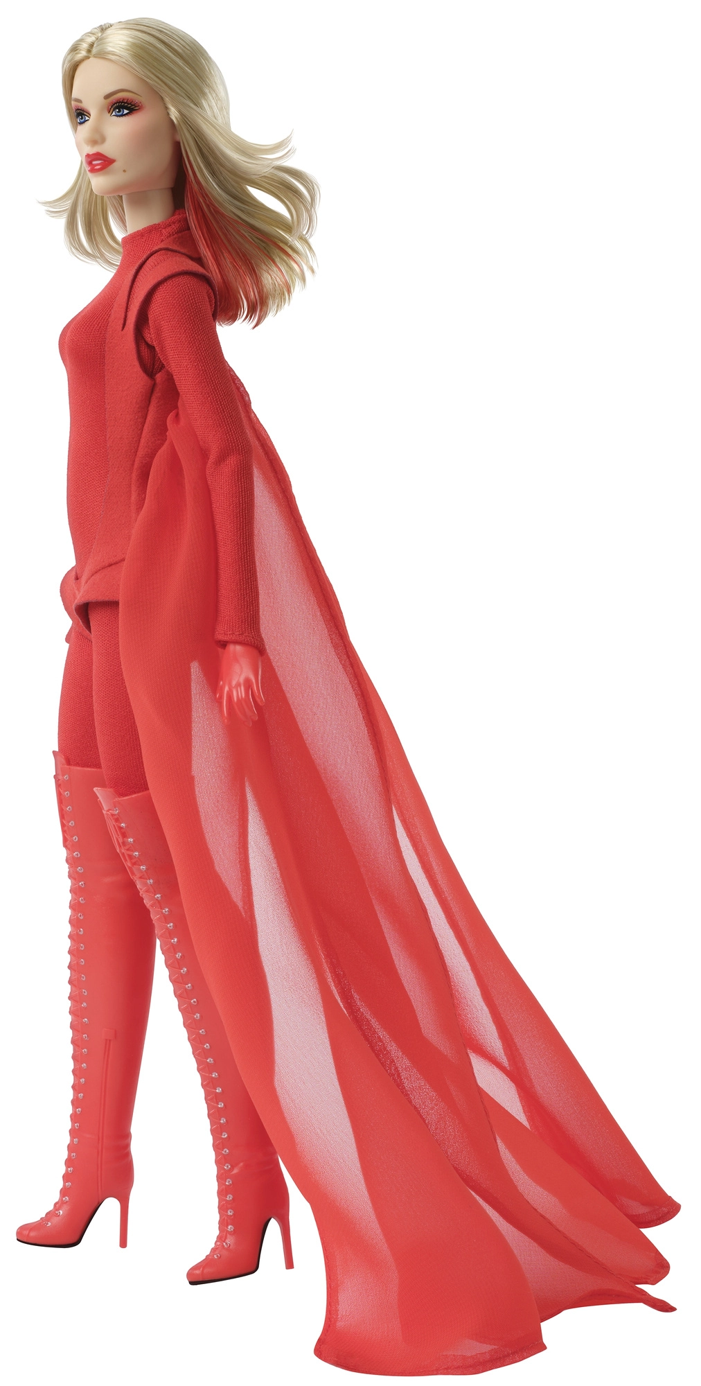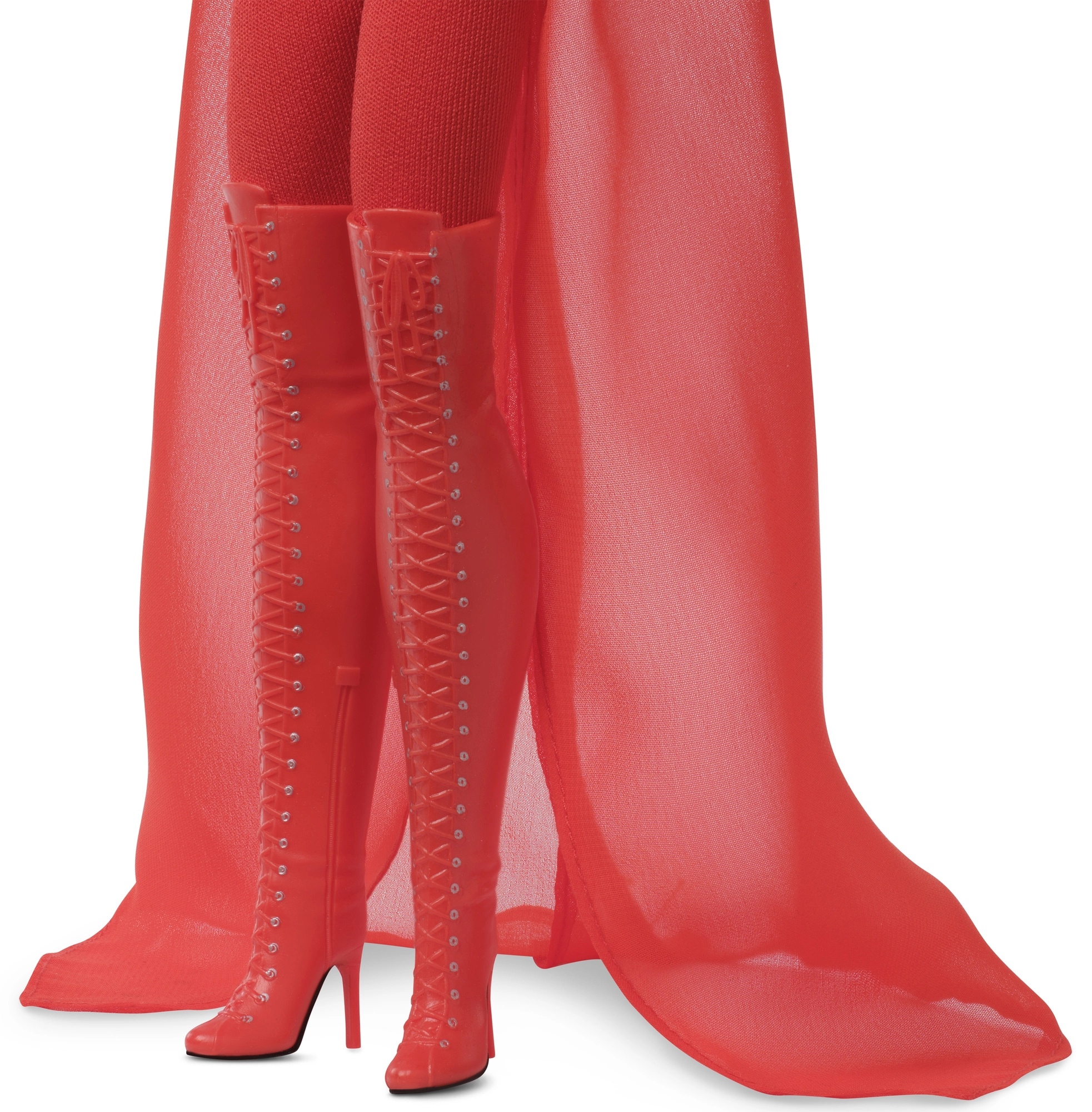 Aprangą sudaro prigludęs raudonas kombinezonas su permatomu efektu ir trumpa viršutinė dalis, pereinanti į ilgą laisvai krintantį apsiaustą. Įvaizdį papildo ilgaauliai virš kelių su raišteliais ir aukštais kulnais – tikras išskirtinis akcentas ekspozicijai.