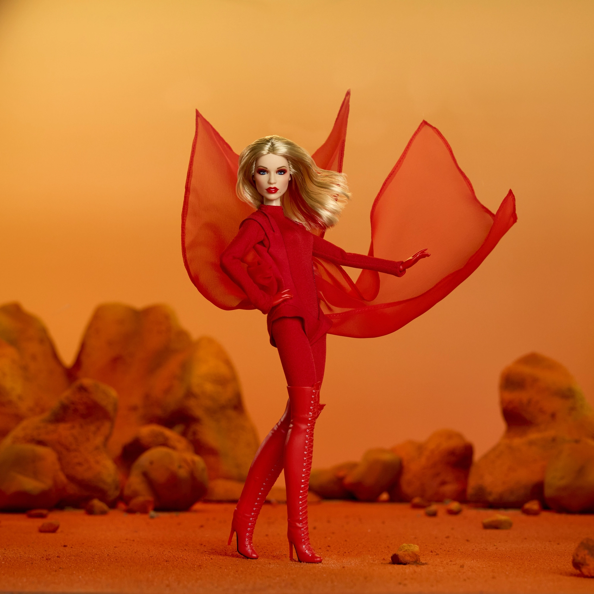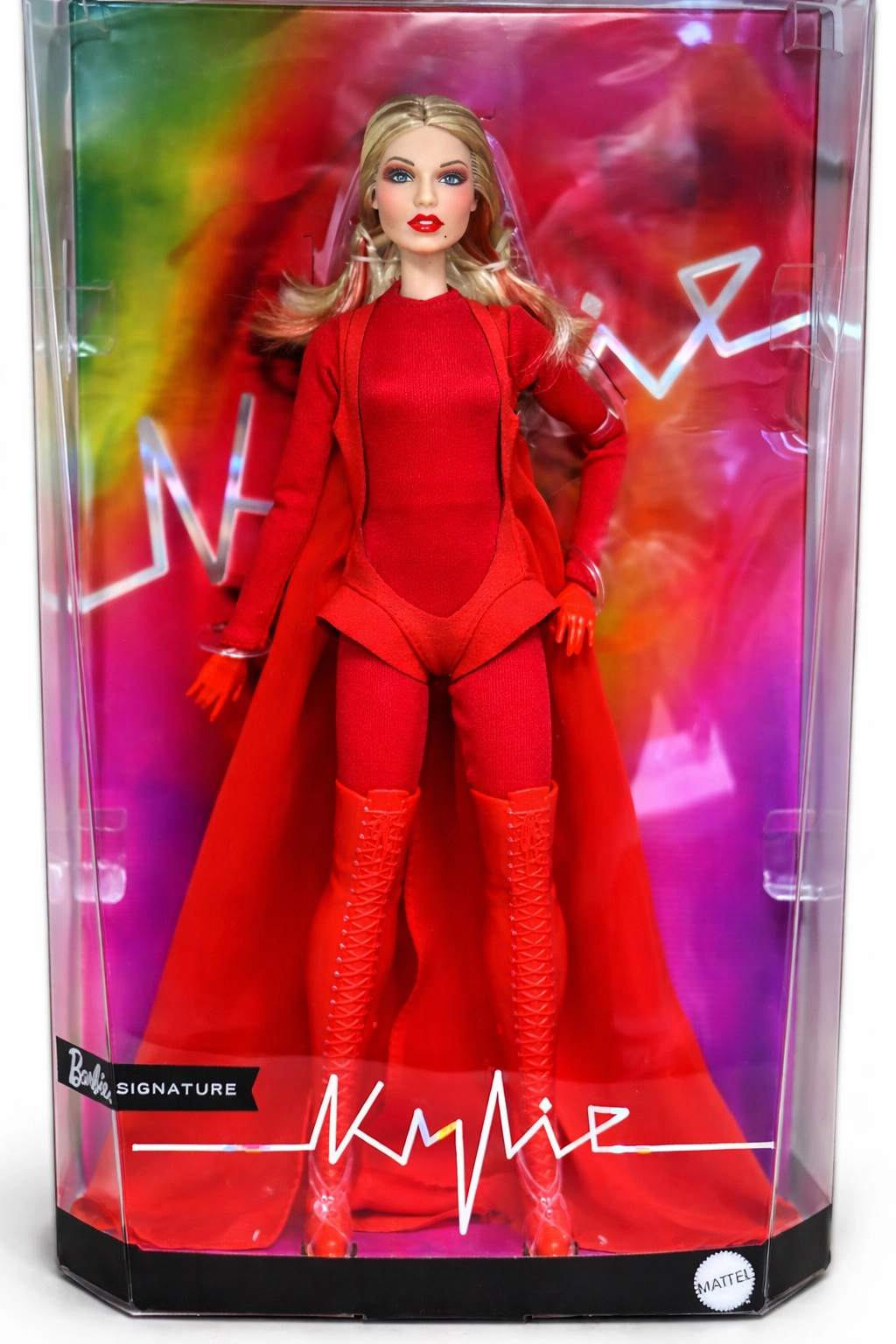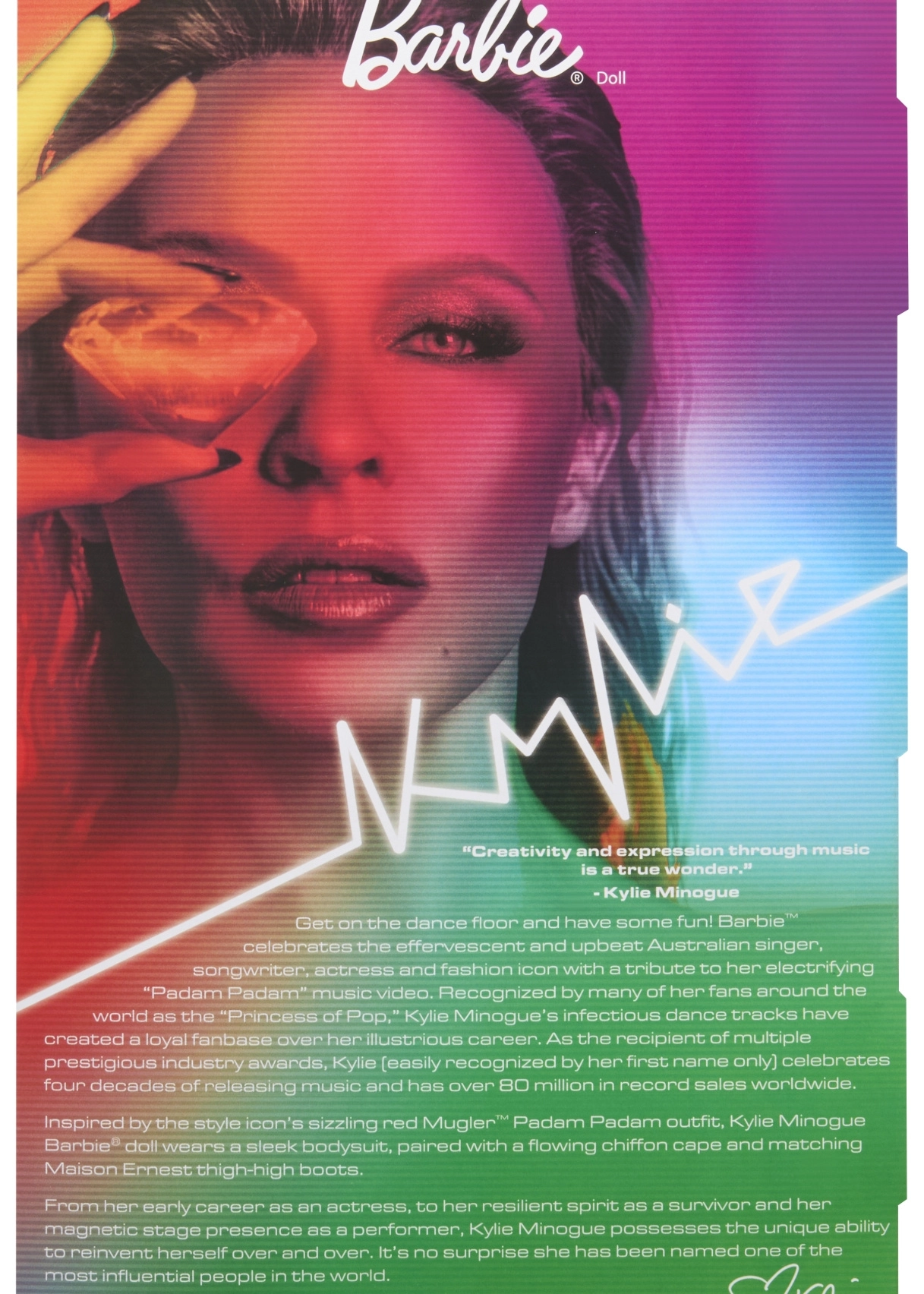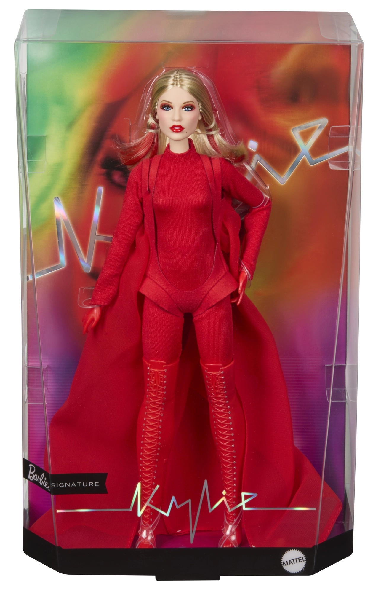 Ši kolekcinė Barbie laida pagerbia įkvepiančias moteris serijoje Role Models. Lėlė atvaizduoja Kylie Minogue dramatiškoje raudonoje stilizacijoje, įkvėptoje muzikinio vaizdo klipo, su ilgais šviesiais plaukais ir subtiliomis raudonomis sruogelėmis, mėlynomis akimis ir precizišku makiažu autentiškam, sceniniam įvaizdžiui.