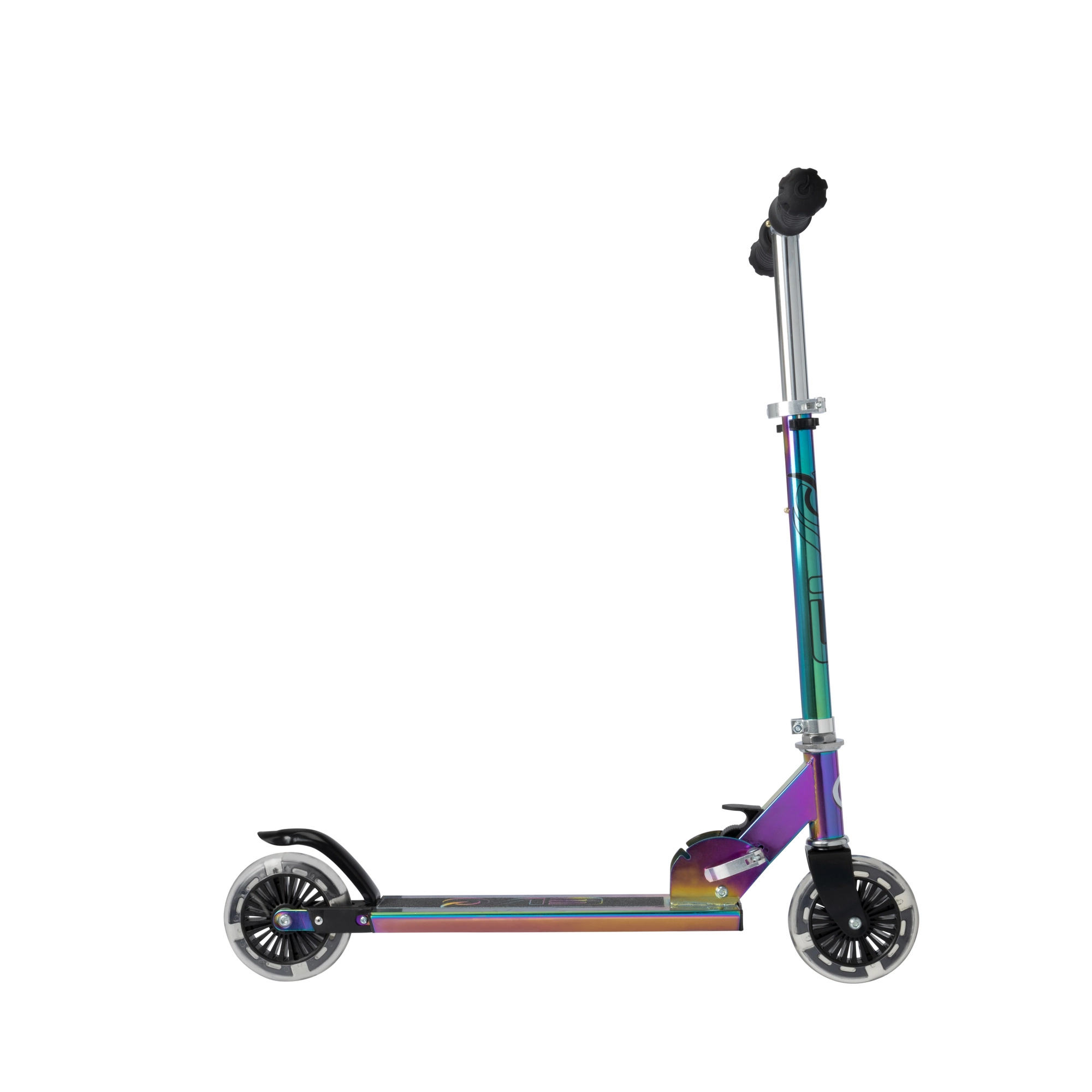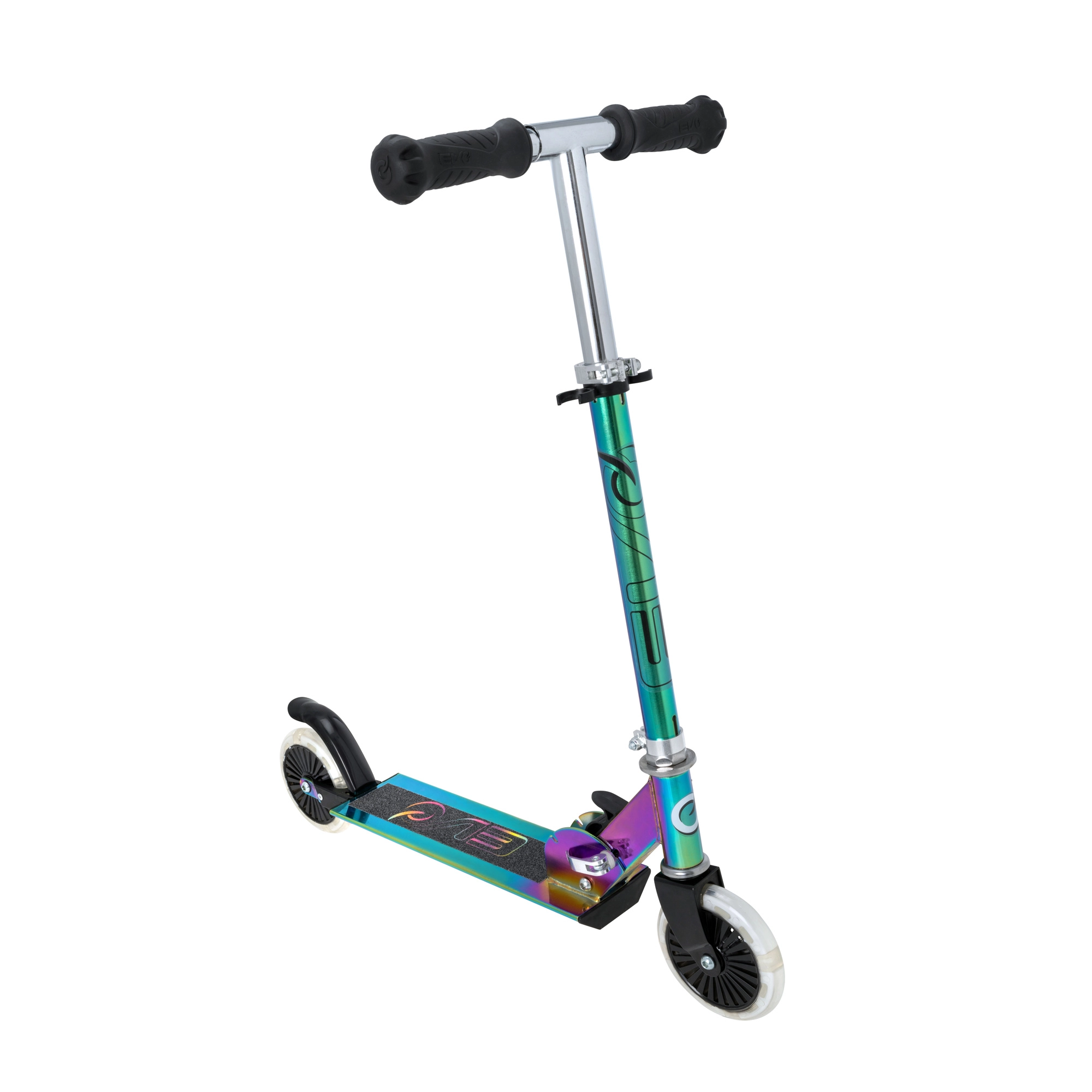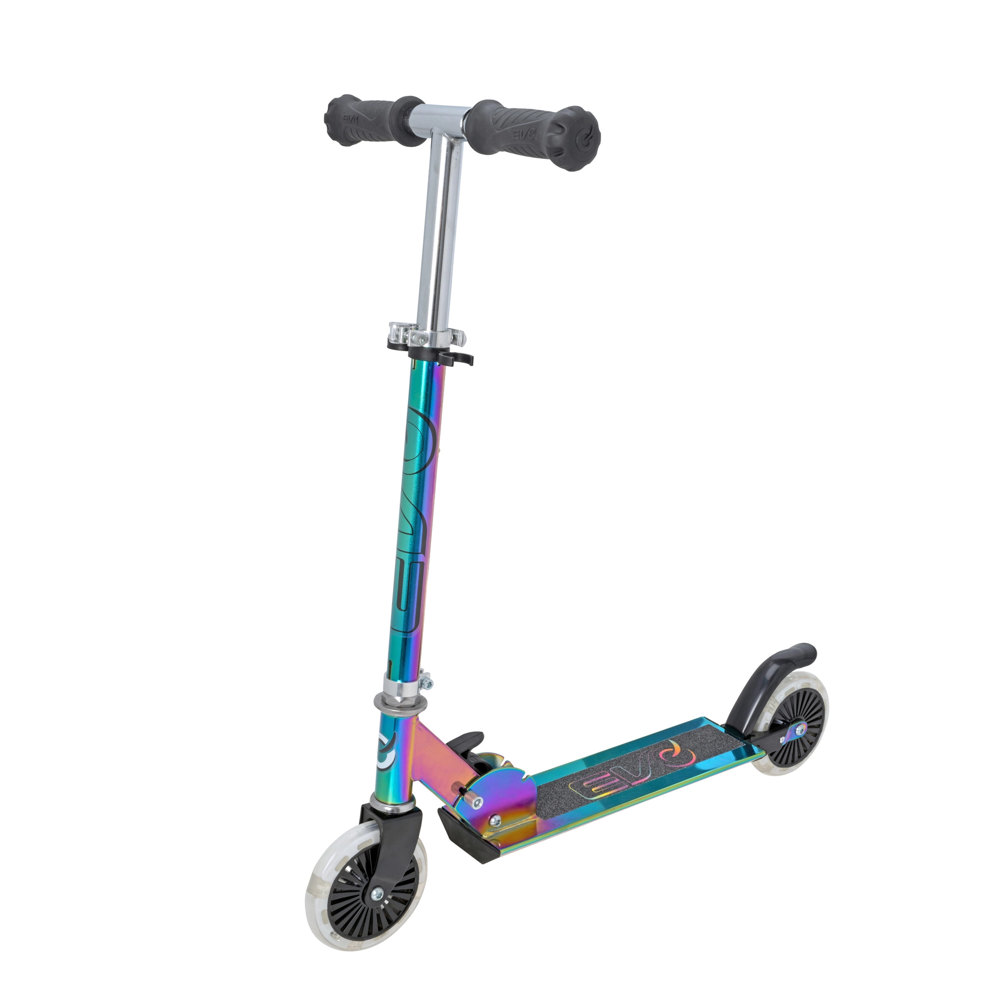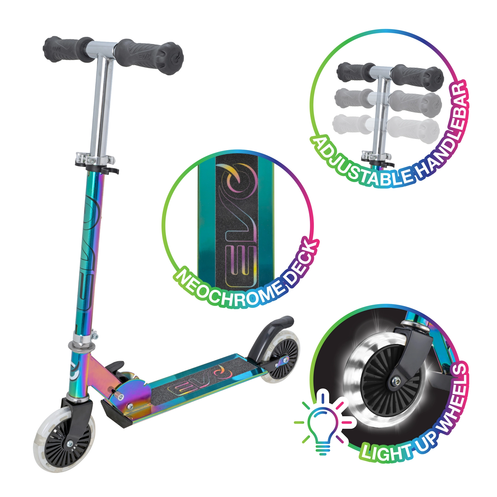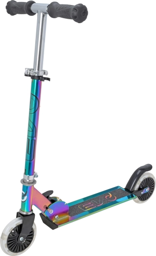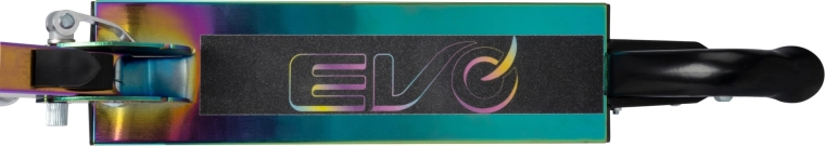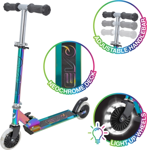 Paspirtukas EVO Light Up Neochrome – puikus pasirinkimas mažiesiems, norintiems išsiskirti. Dėl reguliuojamo vairo (apie 67–77 cm) auga kartu su vaiku, sulankstymo mechanizmas palengvina nešiojimą ir laikymą, o patvari metalinė konstrukcija su neslystančia aikštele suteikia užtikrintumo važiuojant.