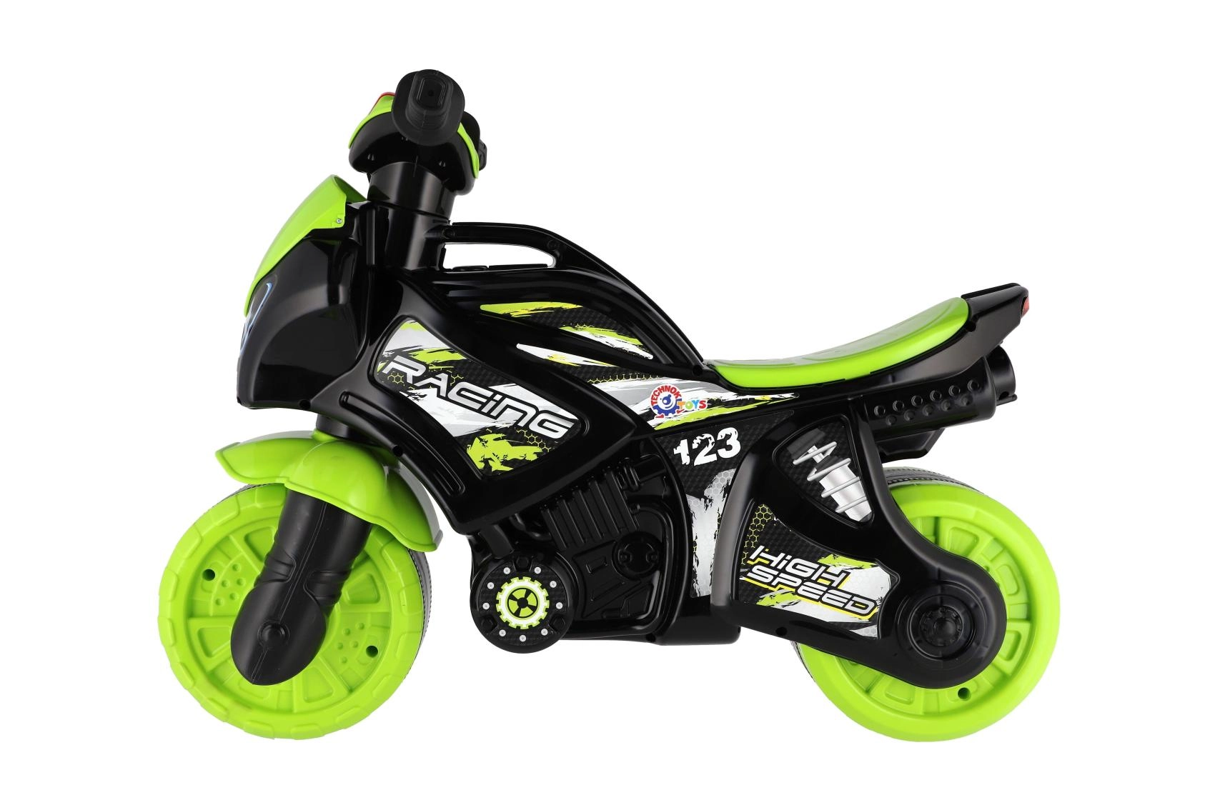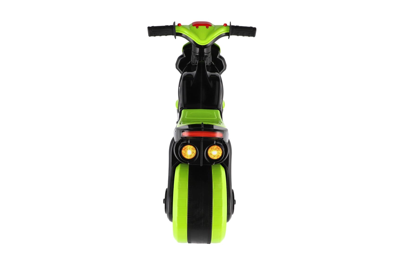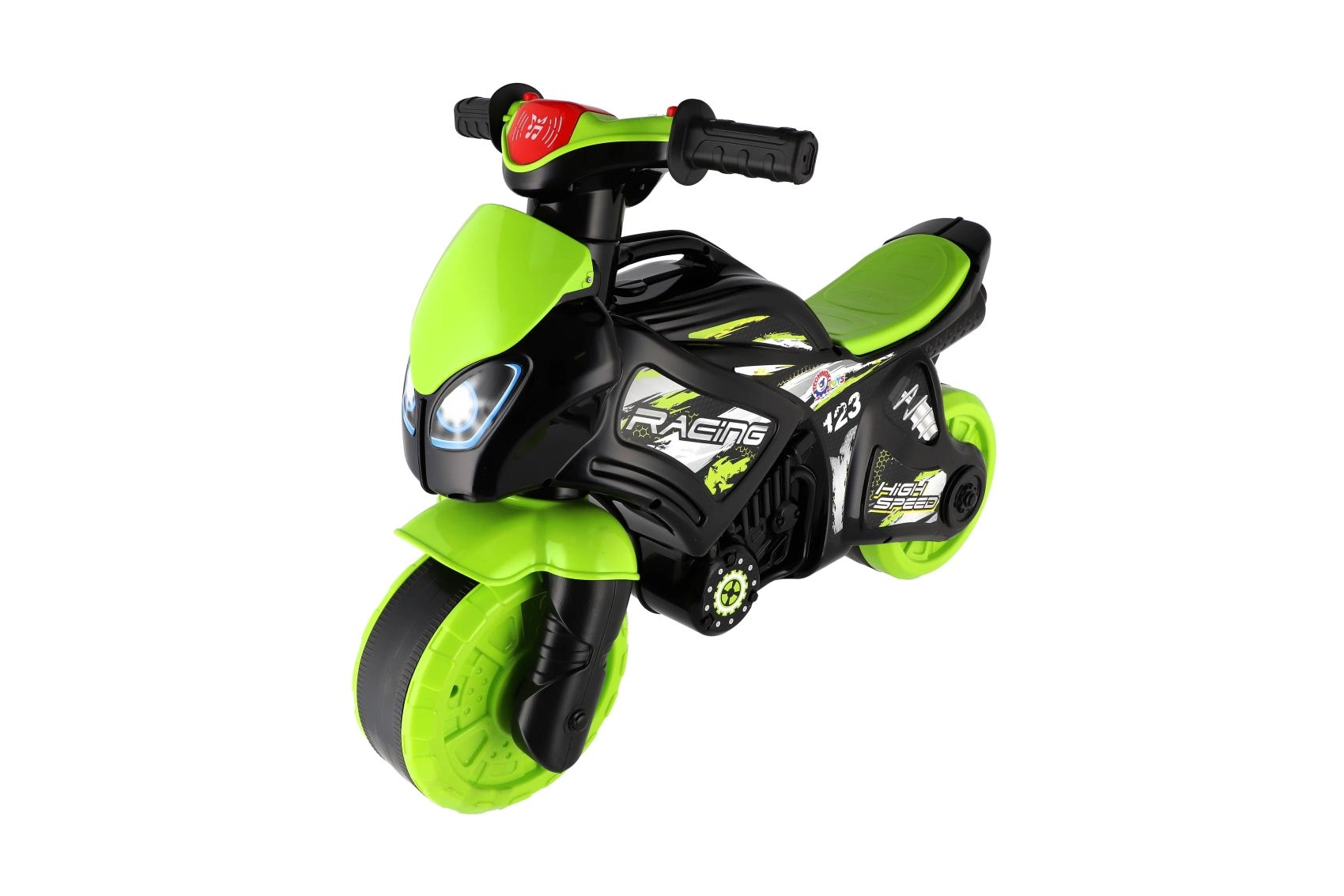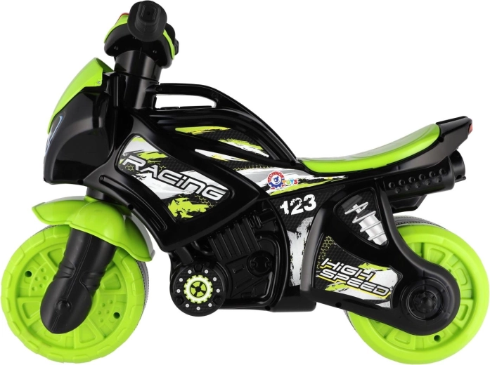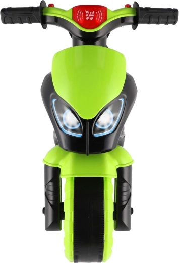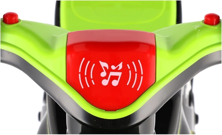 Stilingas vaikiškas balansinis dviratukas lenktyninio motociklo formos pradžiugins kiekvieną mažą vairuotoją. Jis turi plačius ratus stabilumui, ergonomišką sėdynę ir lengvai sugriebiamus vairalazdes. Šiuolaikiškas žaliai–juodas dizainas su sportiniais lipdukais suteikia realistišką išvaizdą, o šviesų ir garso efektai dar labiau pagyvina važiavimą.