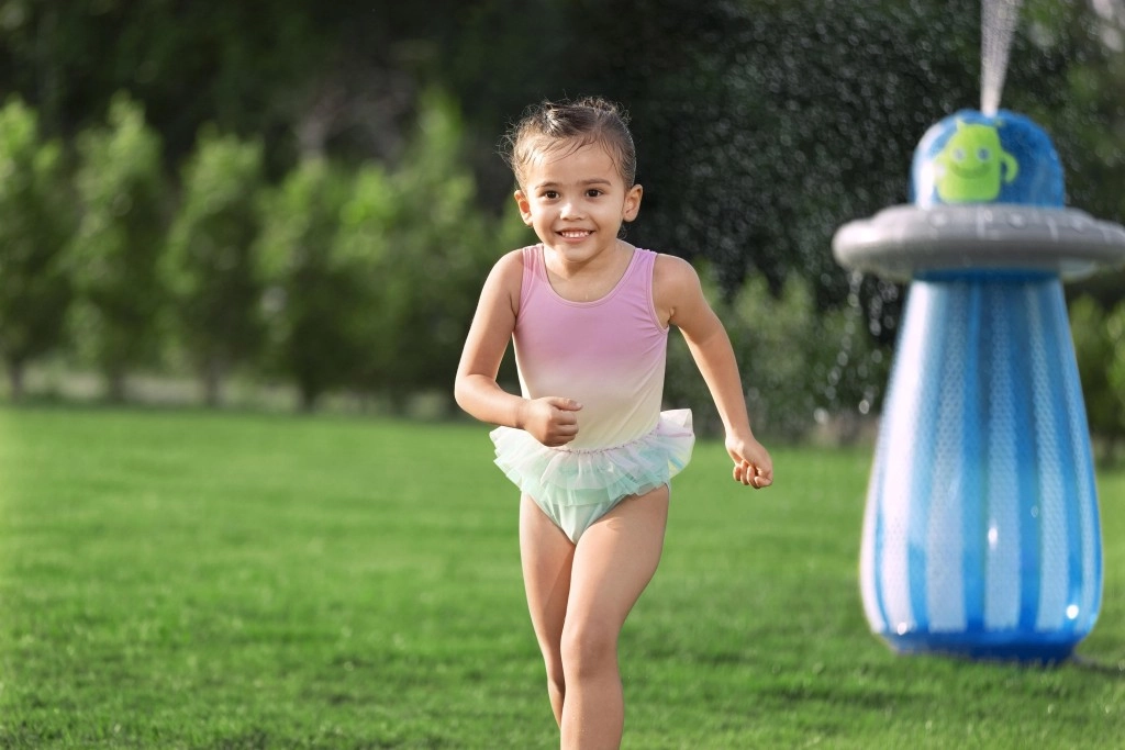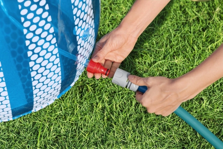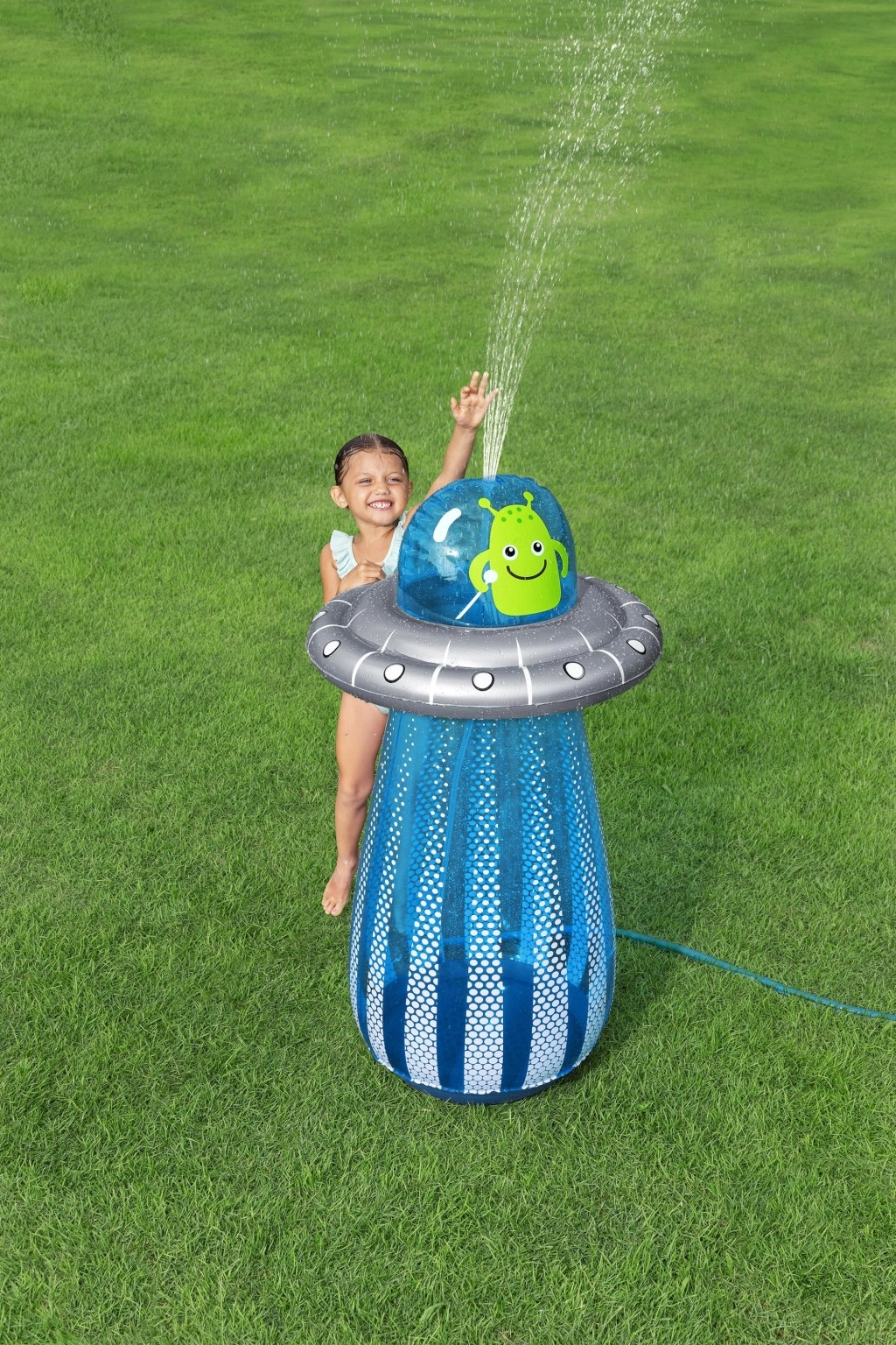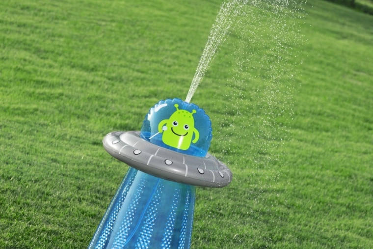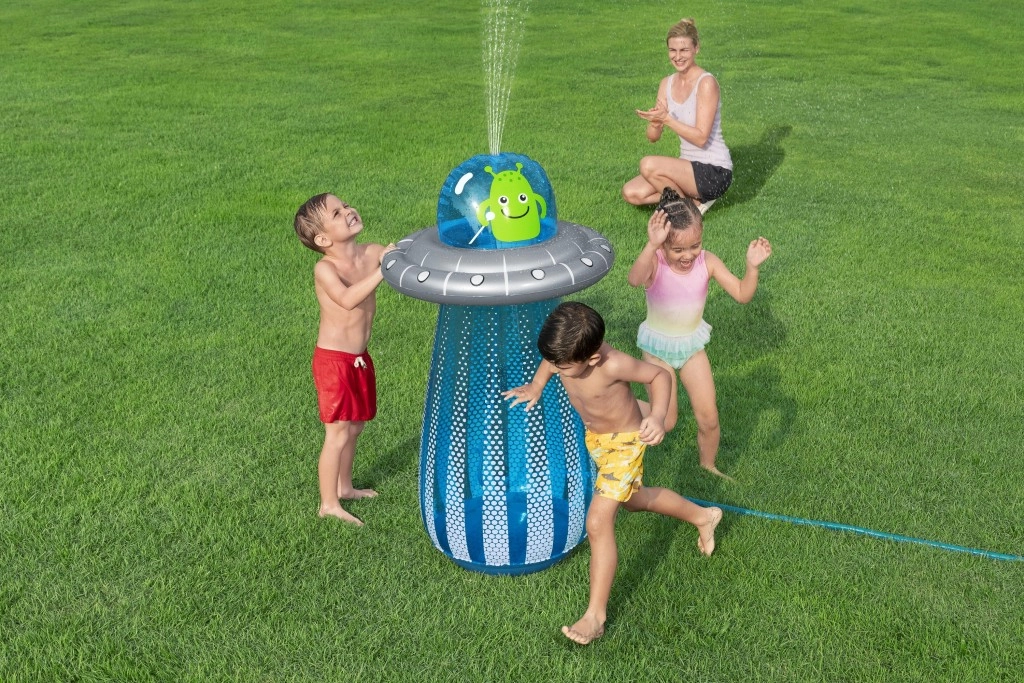 Prijungus prie standartinės sodo žarnos, iš viršutinės NSO dalies paleidžiamas gaivinantis purkštuvas, sukuriantis vaikams žaismingą fontaną.