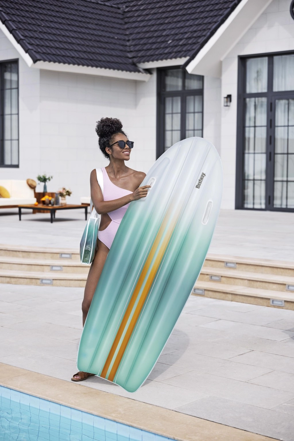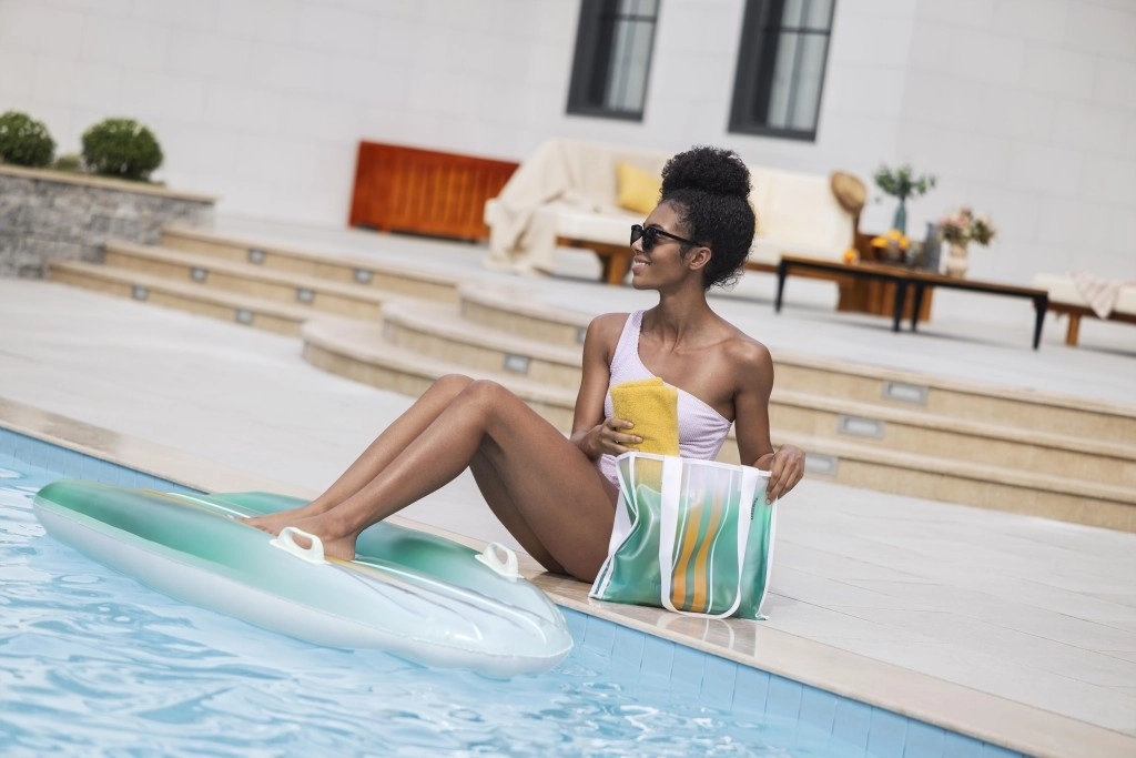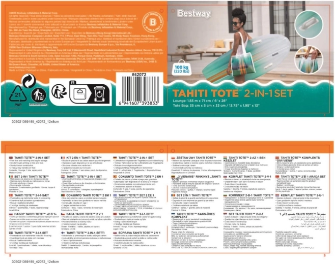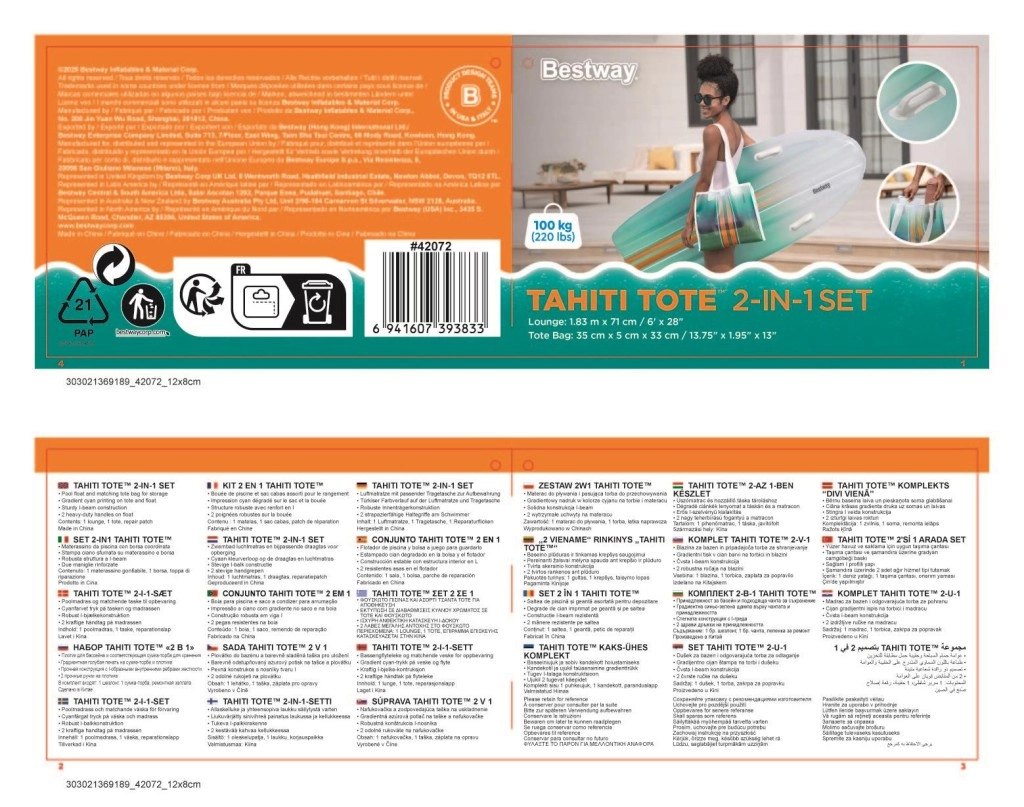 Rinkinys BESTWAY TAHITI derina praktiškumą ir stilių ramiam poilsiui prie vandens. Gultas su hidrodinamine forma ir dviejomis integruotomis rankenomis suteikia užtikrintumo lipant ir ilsintis. Vieningas cianinis gradientinis raštas ant gulto ir krepšio atrodo gaiviai ir vasariškai, todėl išsiskirsite tiek prie baseino, tiek paplūdimyje.
