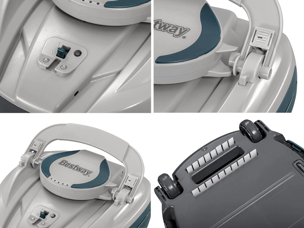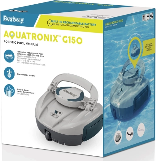Robotinis siurblys BESTWAY AquaTronix G150 užtikrina patogią ir efektyvią baseino priežiūrą dėl visiškai belaidžio veikimo. Išmanūs vandens jutikliai ir kryptiniai purkštukai pasirūpina patikimu judėjimu dugnu, automatiniu įsijungimu panardinus ir išsijungimu iškėlus iš vandens. Didelį 2,0 l talpos filtro krepšį lengva išimti ir per kelias sekundes ištuštinti.