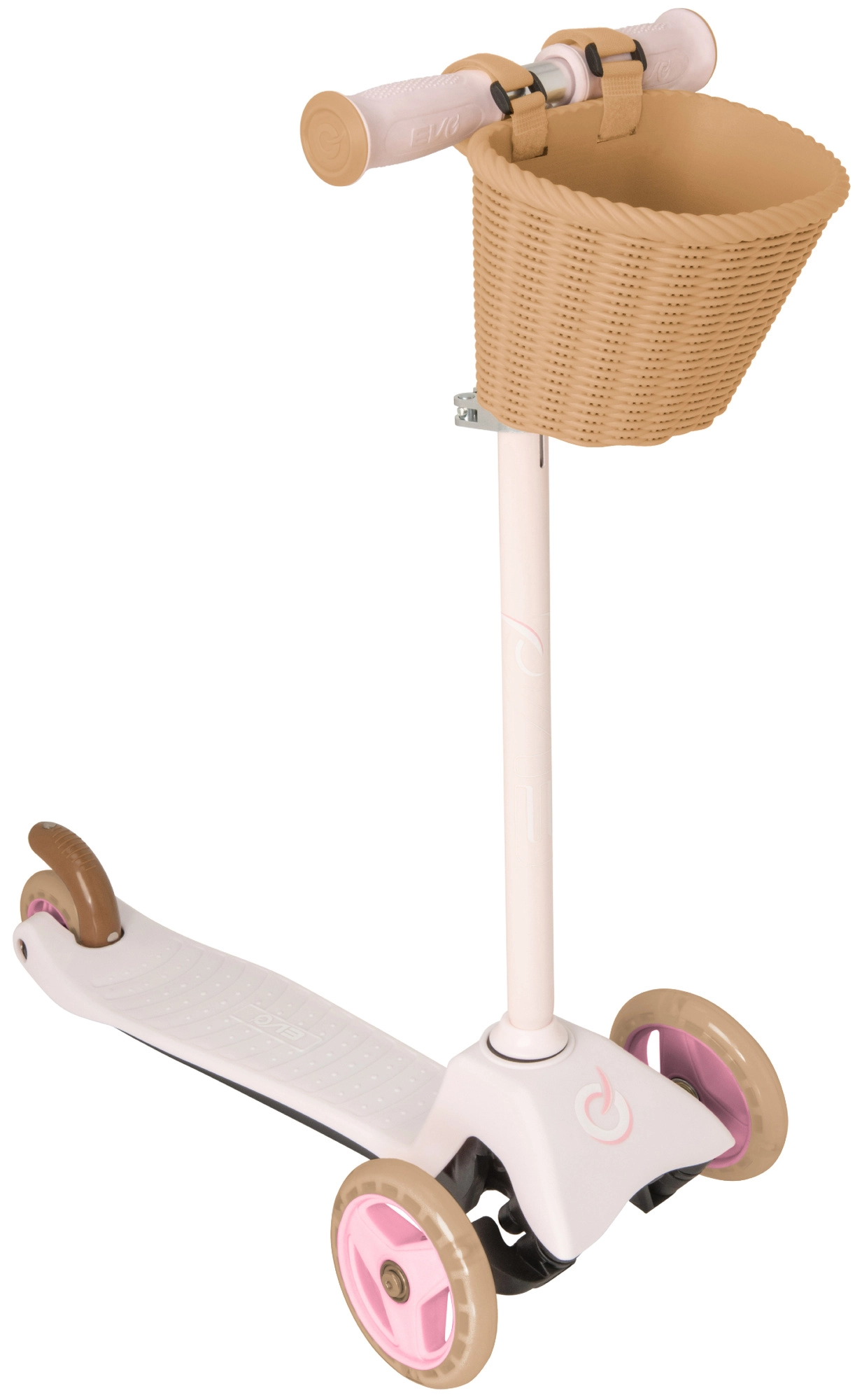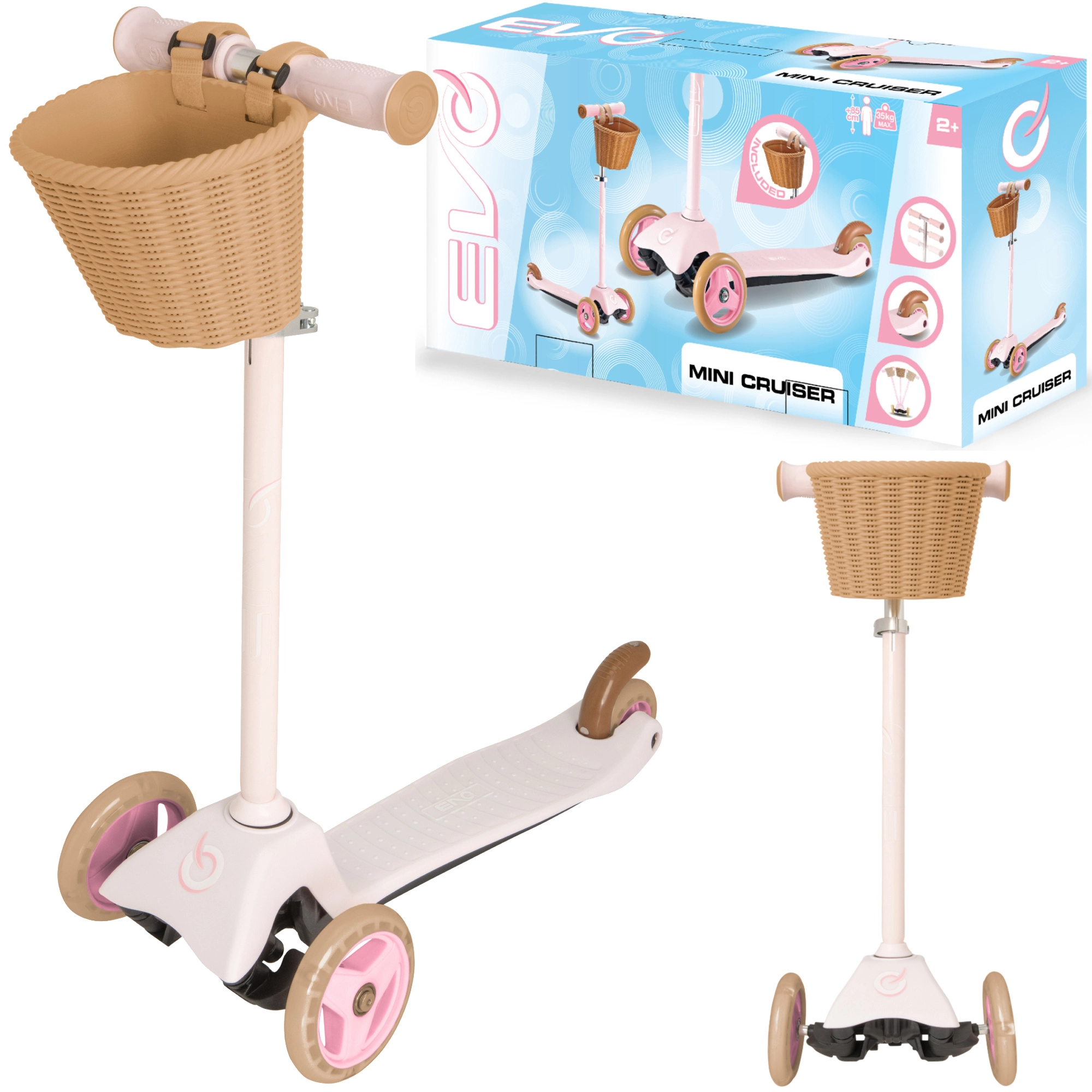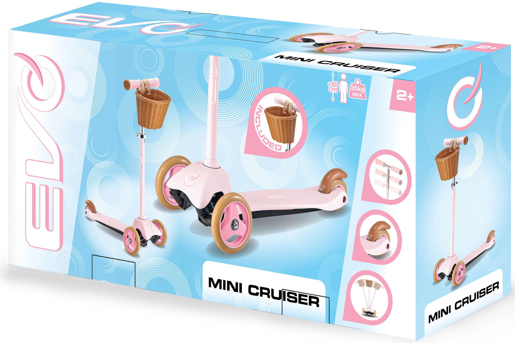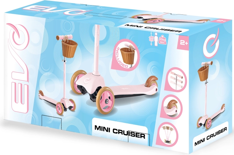 Rožinė paspirtukė EVO Mini Cruiser ideali patiems mažiausiems nuo 2 metų. Dėl trijų ratų, plataus stabilaus pado ir galinio kojinio stabdžio vaikai saugiai ir linksmai mokosi pusiausvyros bei koordinacijos. Aukščio reguliuojamas vairas auga kartu su vaiku, o nuimamas krepšelis talpina smulkmenas kelionei.