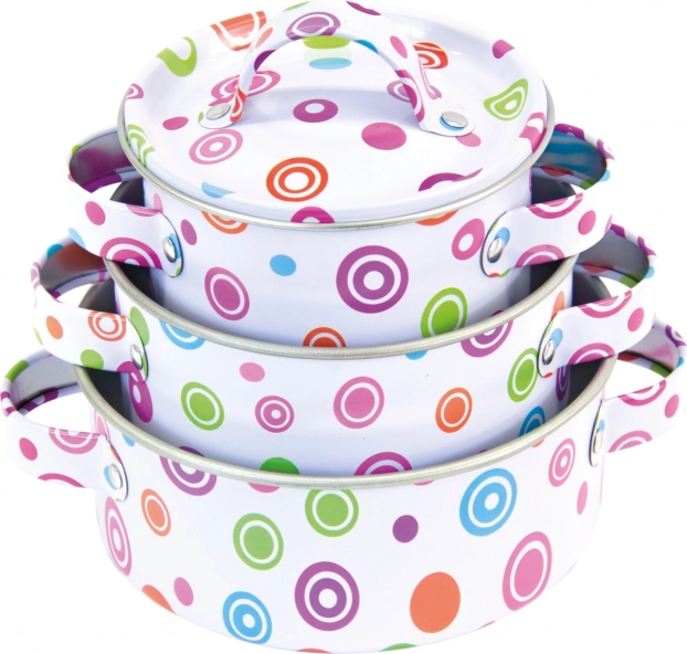 Šis kokybiškas emaliuotų indų rinkinys vaikams puikiai tinka žaisti virtuvėje. Metaliniai puodai, keptuvė ir įrankiai atrodo autentiškai, todėl vaikai gali mėgautis tikrovišku gaminimu ir patiekimu. Spalvoti taškeliai ant balto pagrindo suteikia rinkiniui linksmą išvaizdą, kuri pagyvins kiekvieną vaikų kampelį.