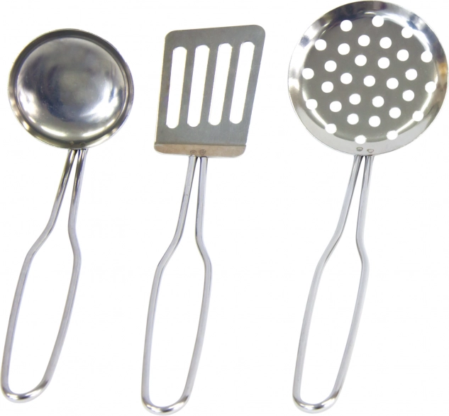 Puodai, keptuvė ir įrankiai iš metalo atrodo kaip tikri, todėl vaikai gali kuo tikroviškiau mėgdžioti gaminimą ir patiekimą.
