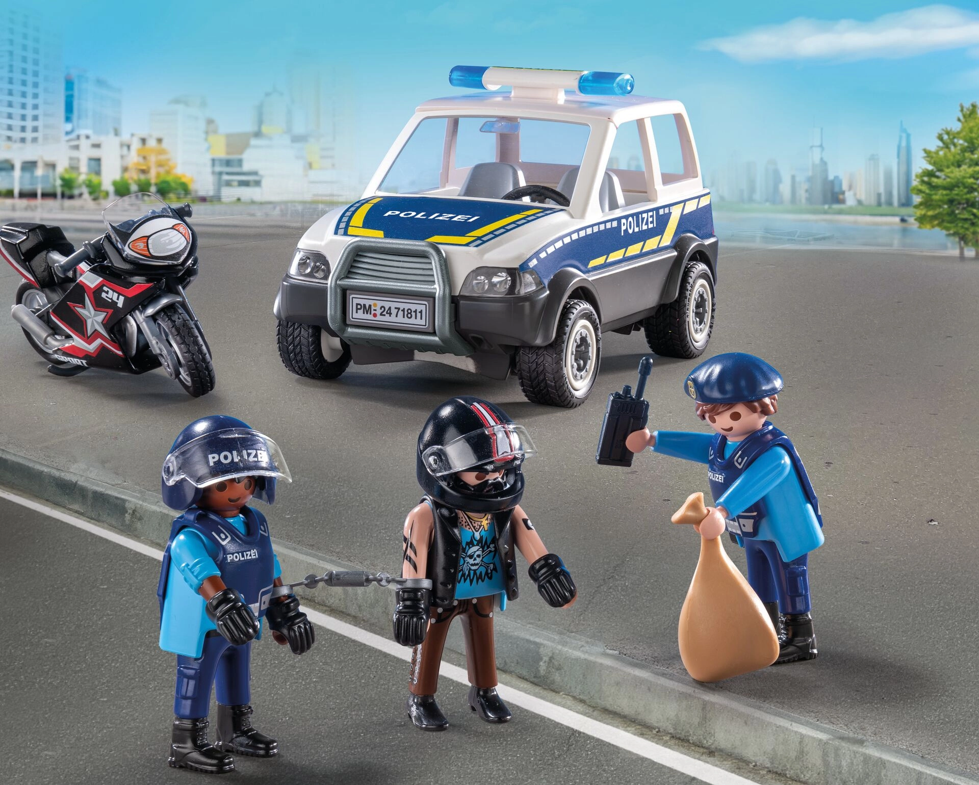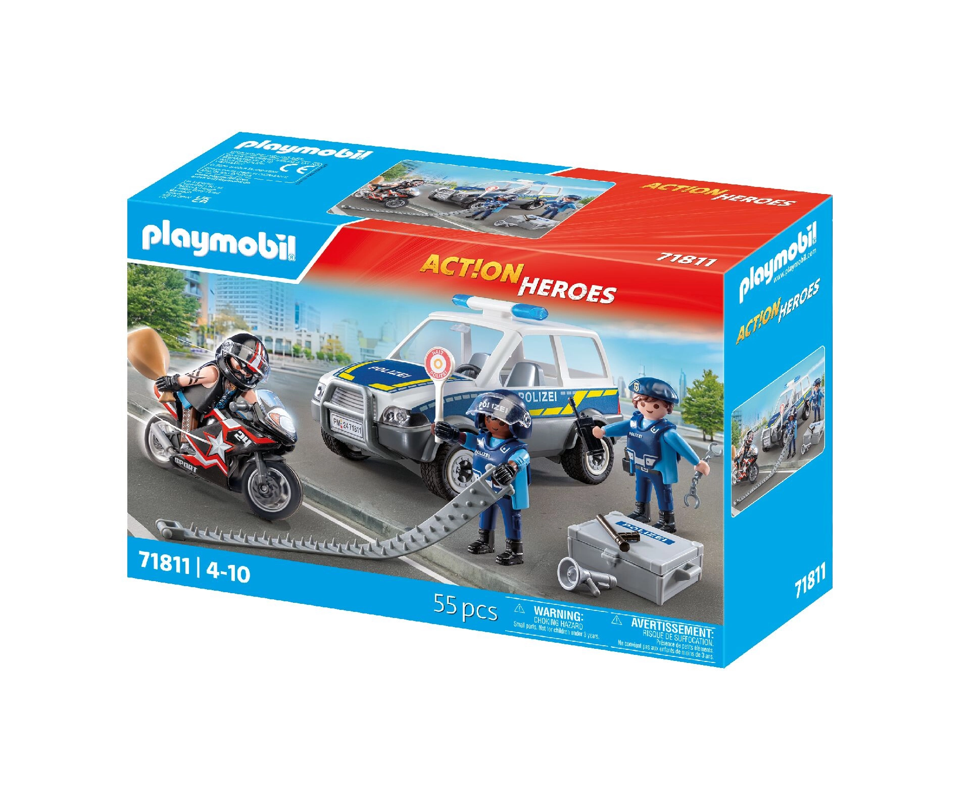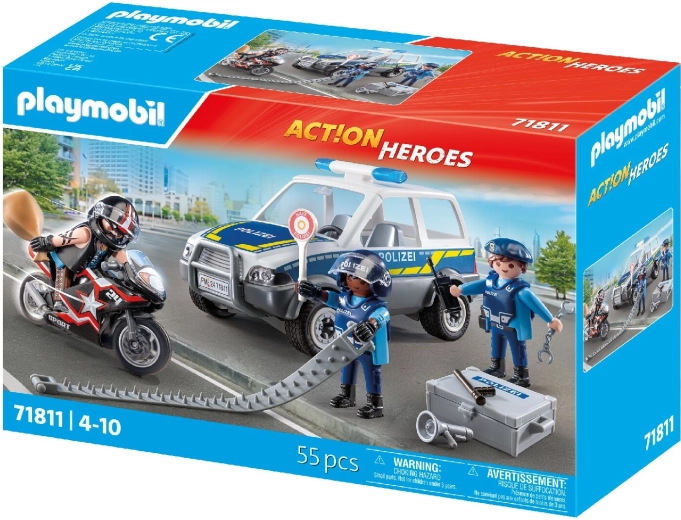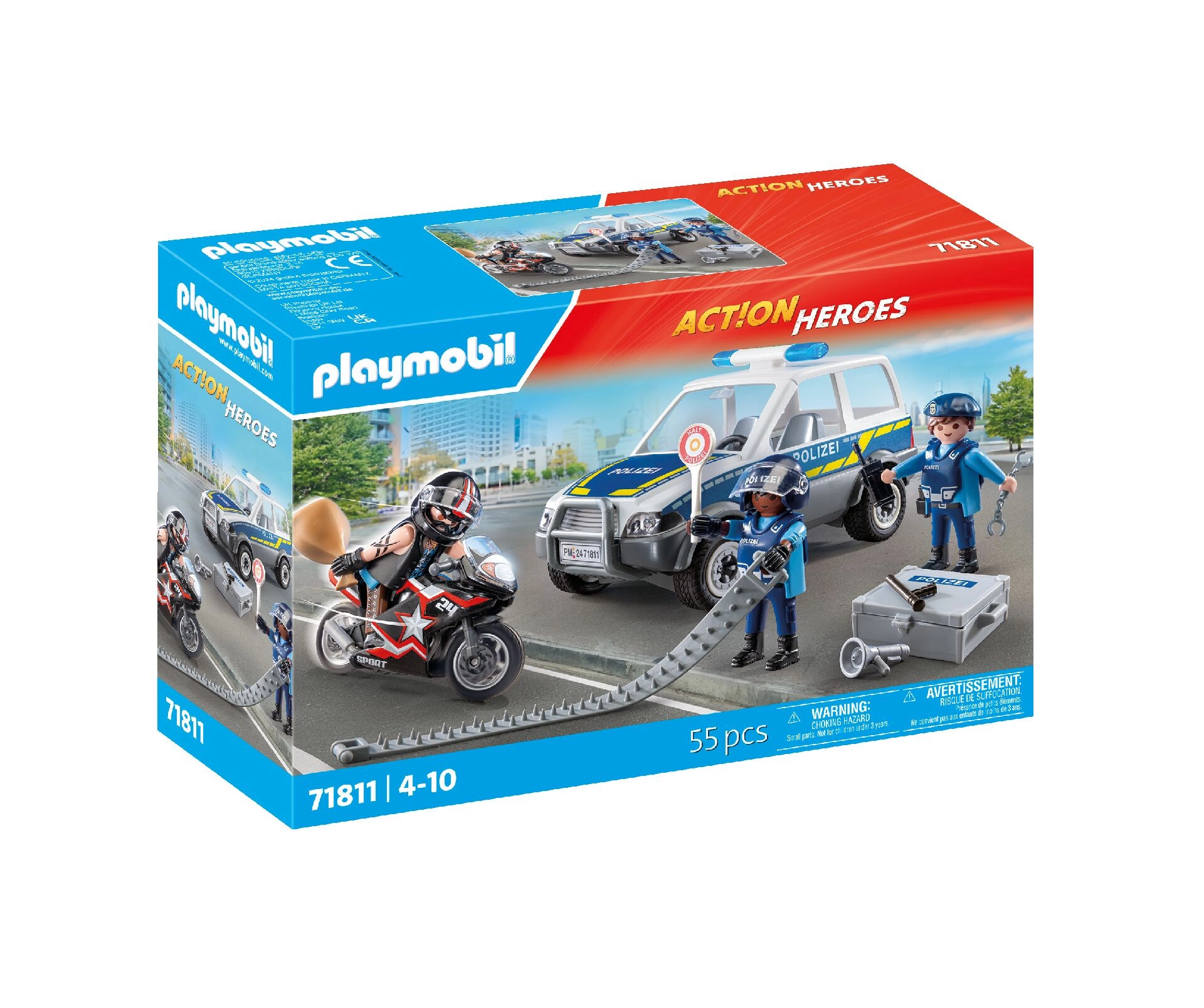 Veiksmo konstruktorius PLAYMOBIL City Heroes atneša įtemptas policijos gaudynes su tarnybiniu motociklu, vagies automobiliu ir trimis judriomis figūrėlėmis. Vaikai mėgausis realistiškomis detalėmis, gausybe priedų ir savo pačių istorijų kūrimu, kuris lavina vaizduotę, koordinaciją ir loginį mąstymą.